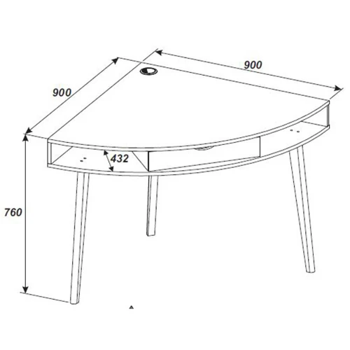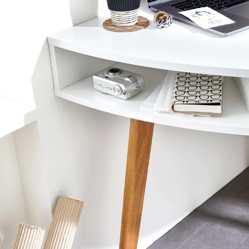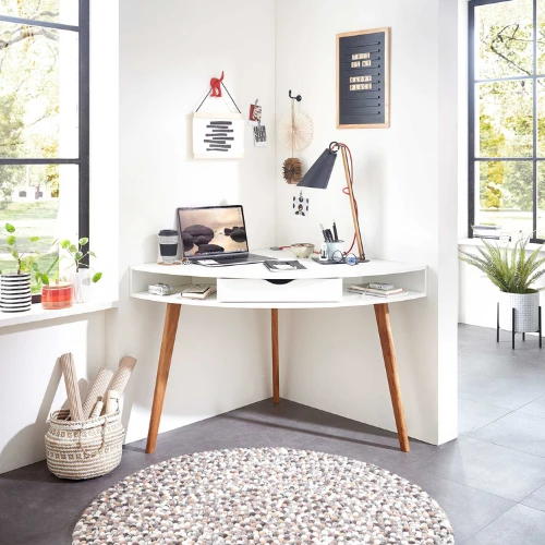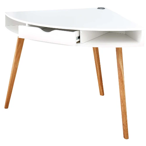 Hoekbureau Inovo 90x90x76cm uit spaanplaat met eikenhouten poten. Afwerking in witte melamine.