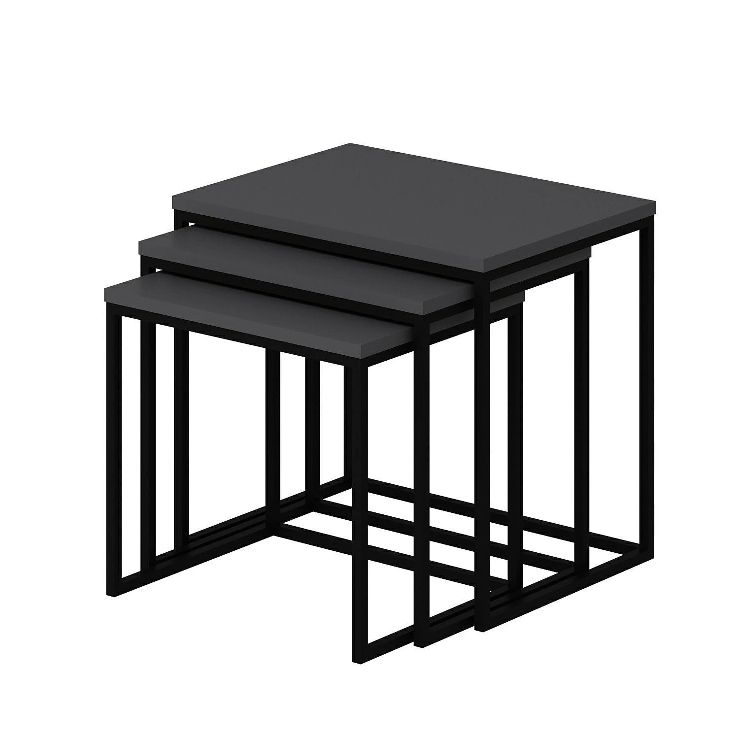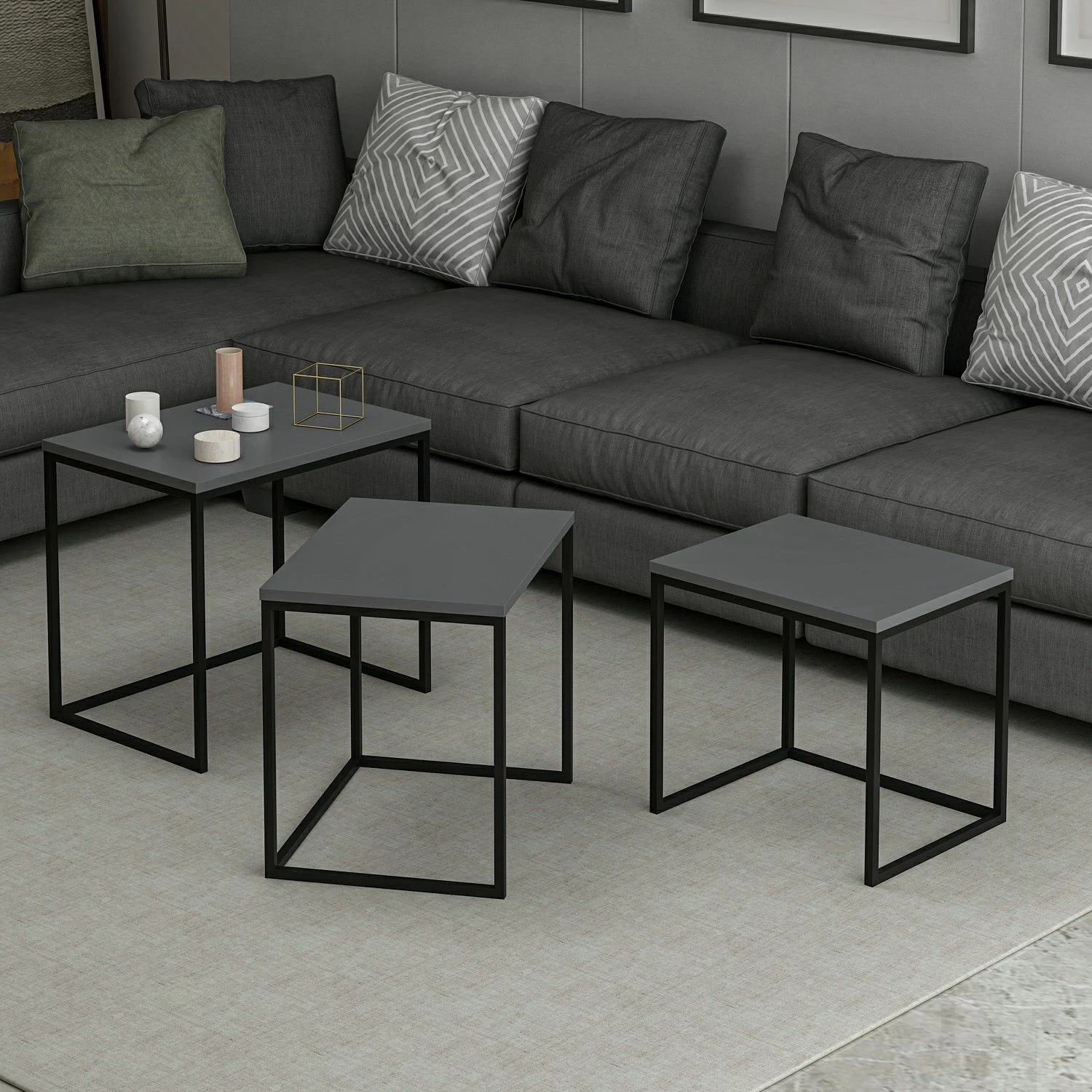 Elke tafel wordt geleverd met een stevig metalen frame, dat extra steun biedt en een modern tintje geeft aan het algehele ontwerp. De set bestaat uit drie tafels van verschillende afmetingen, zodat je ze in elkaar kunt schuiven als je ze niet gebruikt om ruimte te besparen.