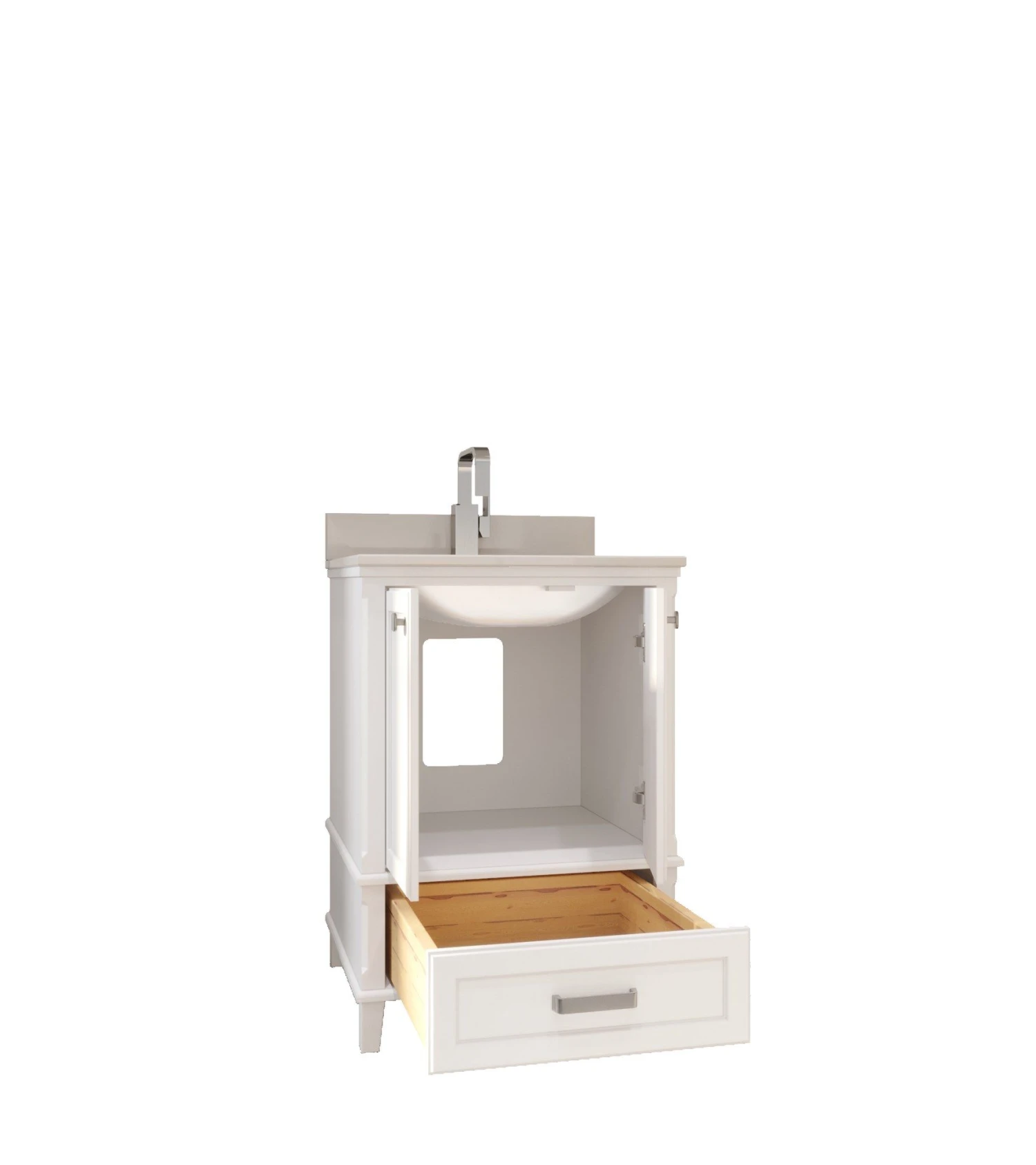 De Jussara badkamermeubelset bestaat uit een badmeubel van massief hout, een wit kwarts aanrechtblad met een porseleinen onderbouwwastafel en een vlakke spiegel met chromen handgrepen. De set heeft een strakke witte kleur en afmetingen van 60cmx22cmx56cm voor het badmeubel en 55cmx80cm voor de spiegel.