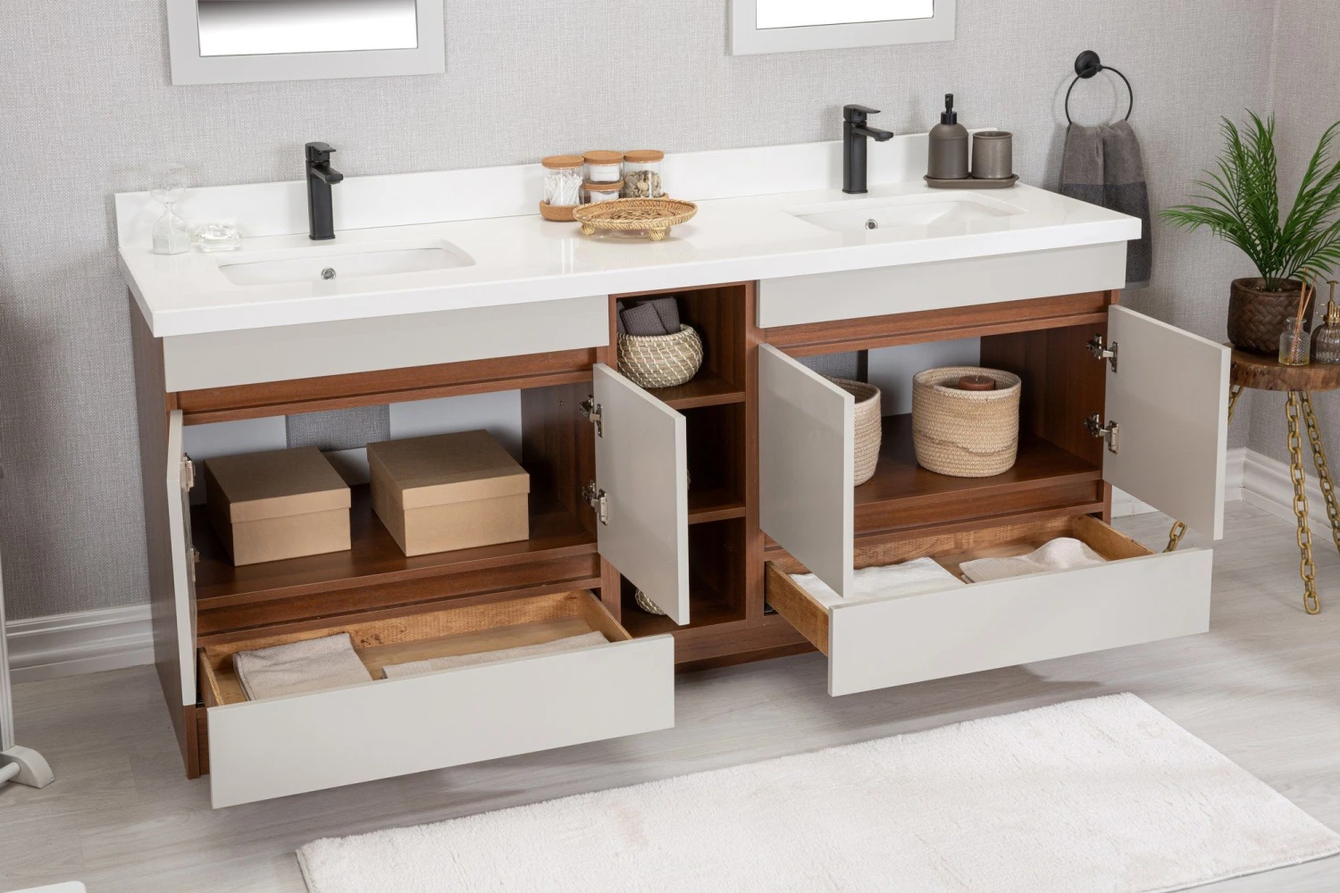 Jussara badkamermeubelset bestaat uit een badmeubel, aanrechtblad met onderbouwwastafel, lade en flotale spiegel. Gemaakt van hoogwaardige materialen. Crème kleur