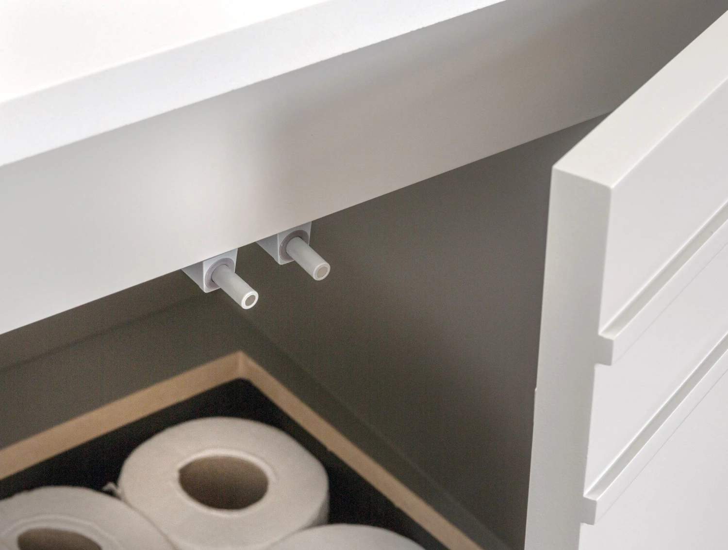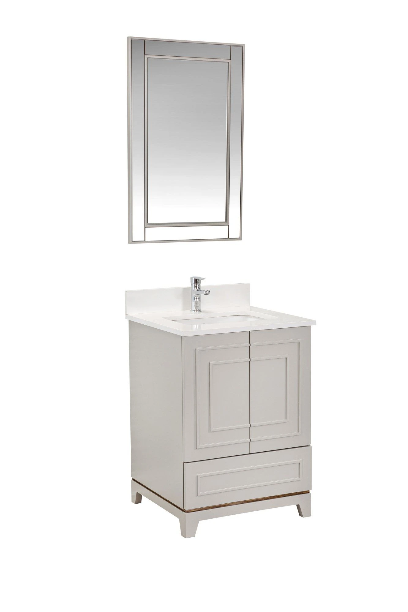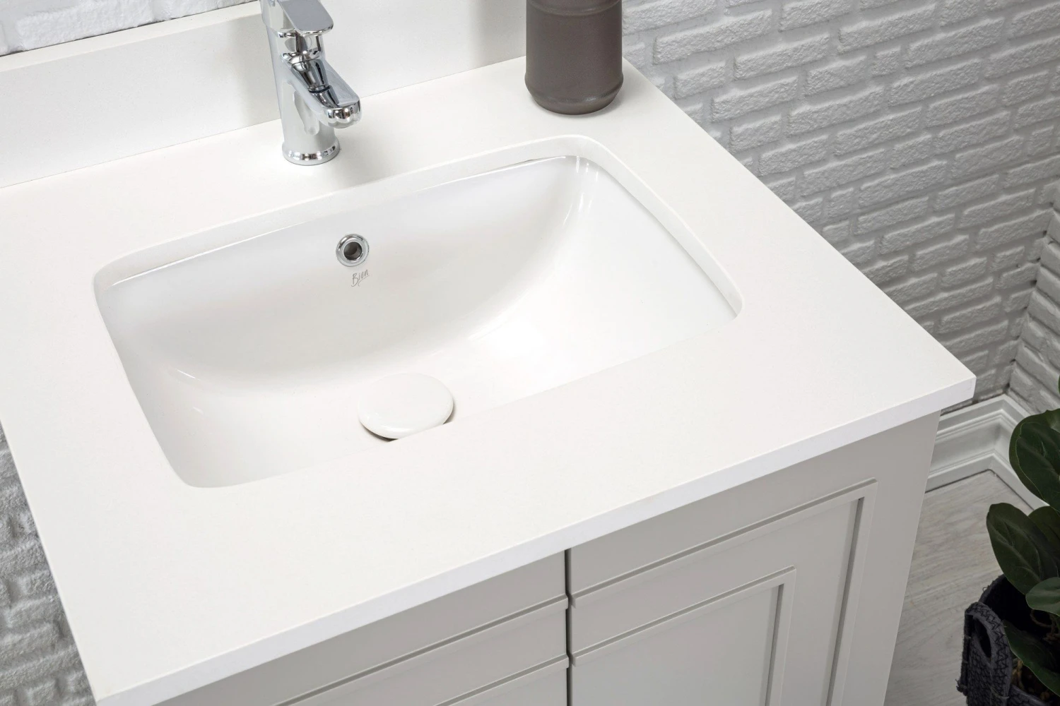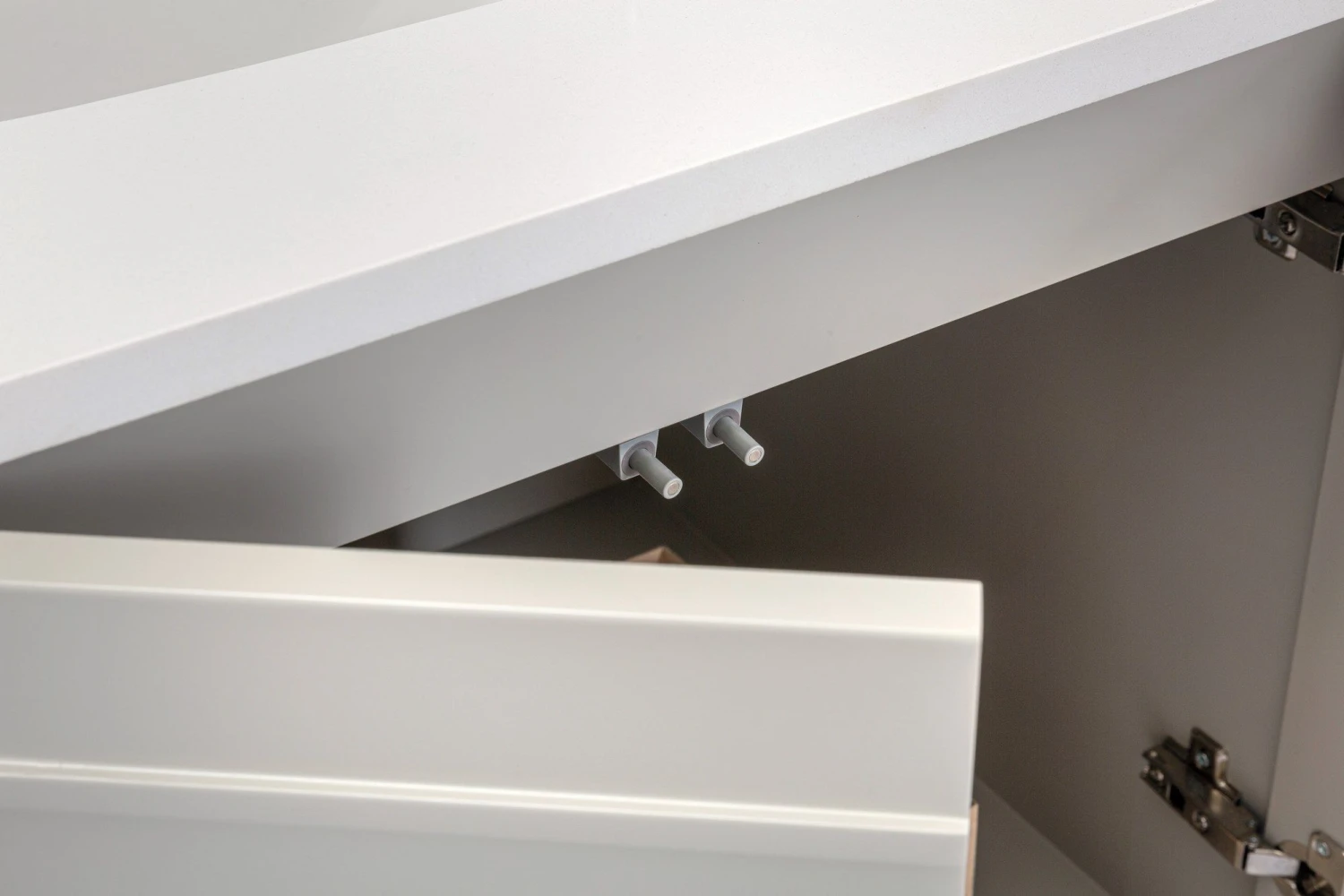 Jussara badkamermeubelset: 2-delige set gemaakt van hoogwaardig materiaal – massief hout, wit kwartsblad, marinehouten lade en grijs kleurenschema, voor een stijlvolle en duurzame opbergoplossing voor je badkamer.