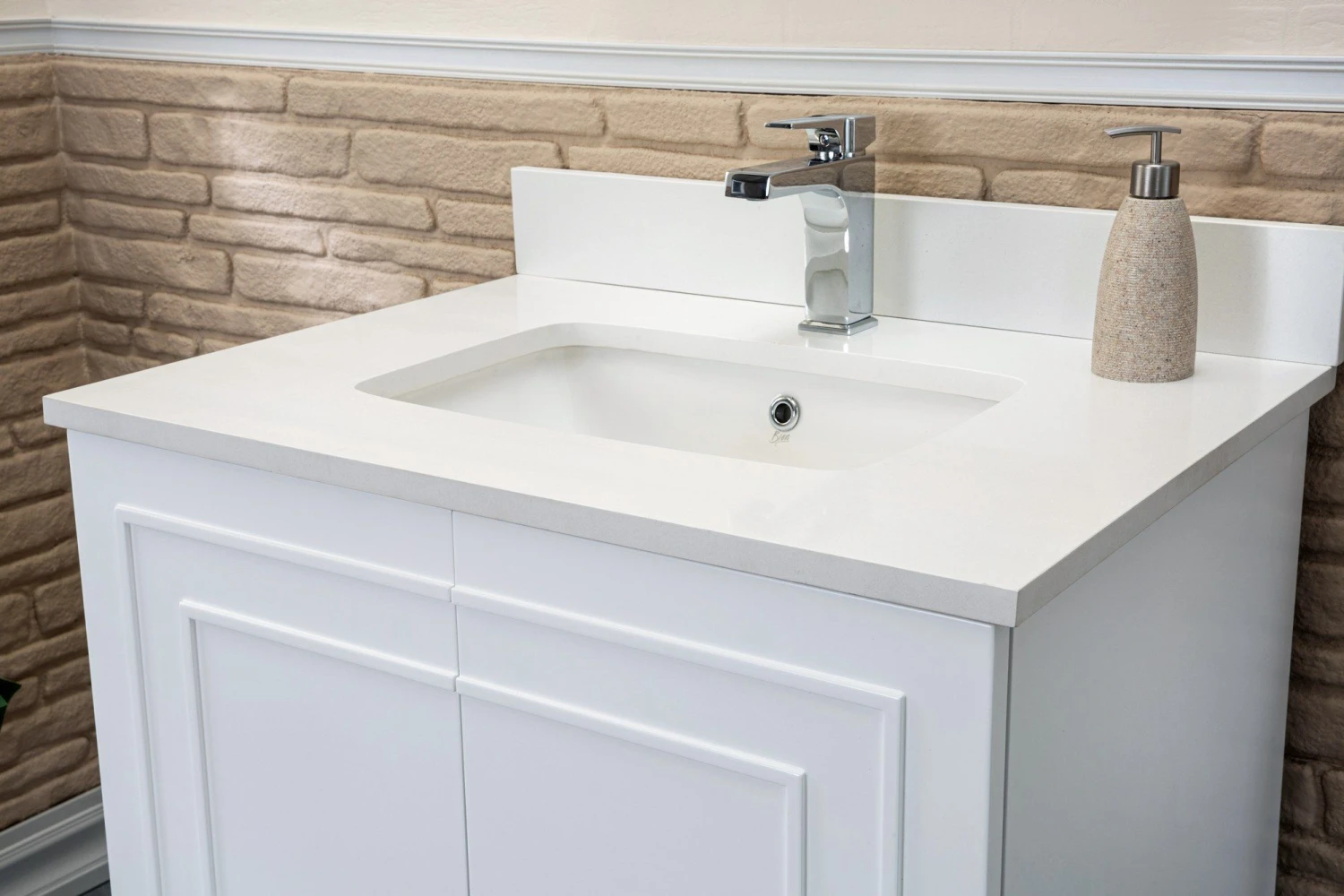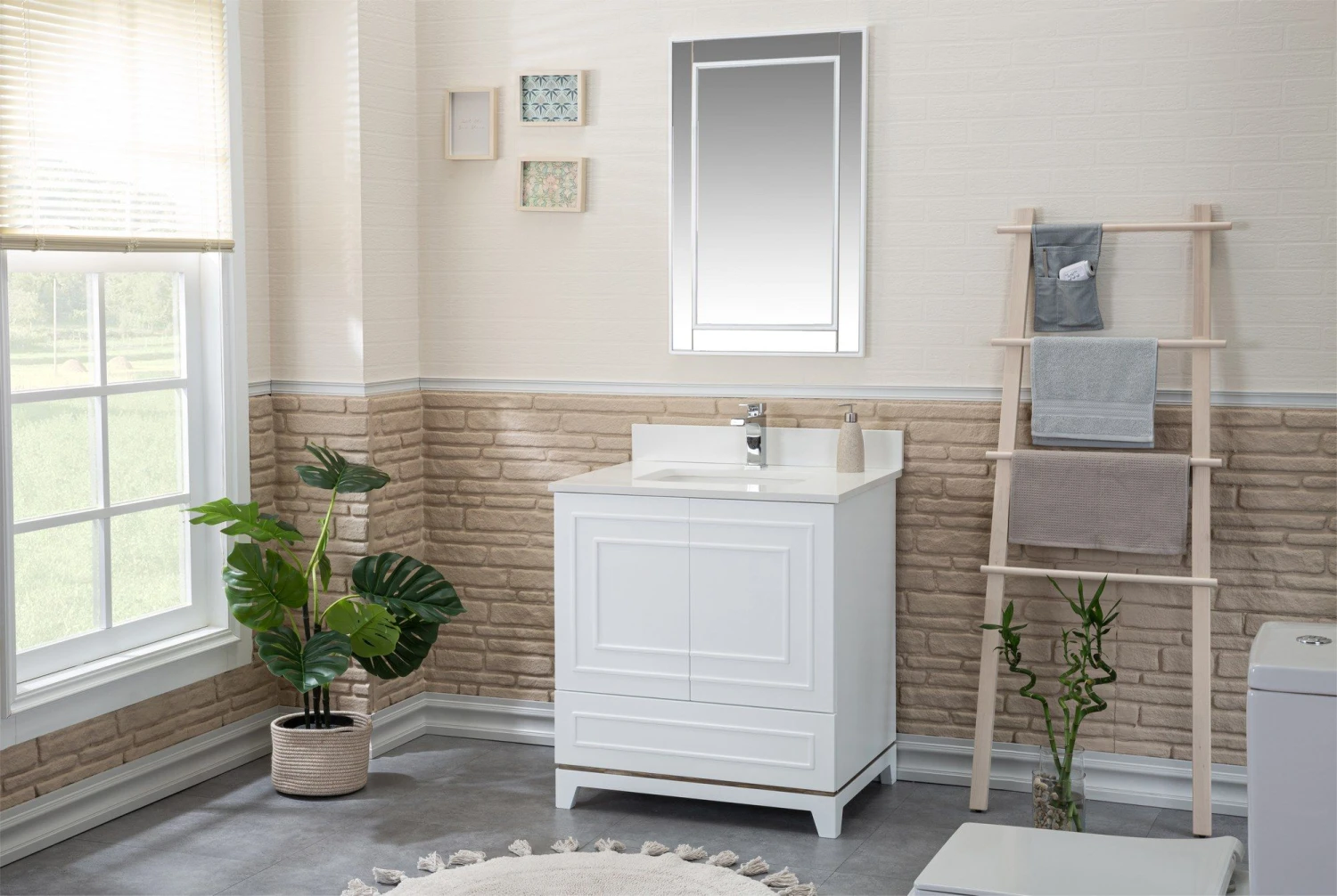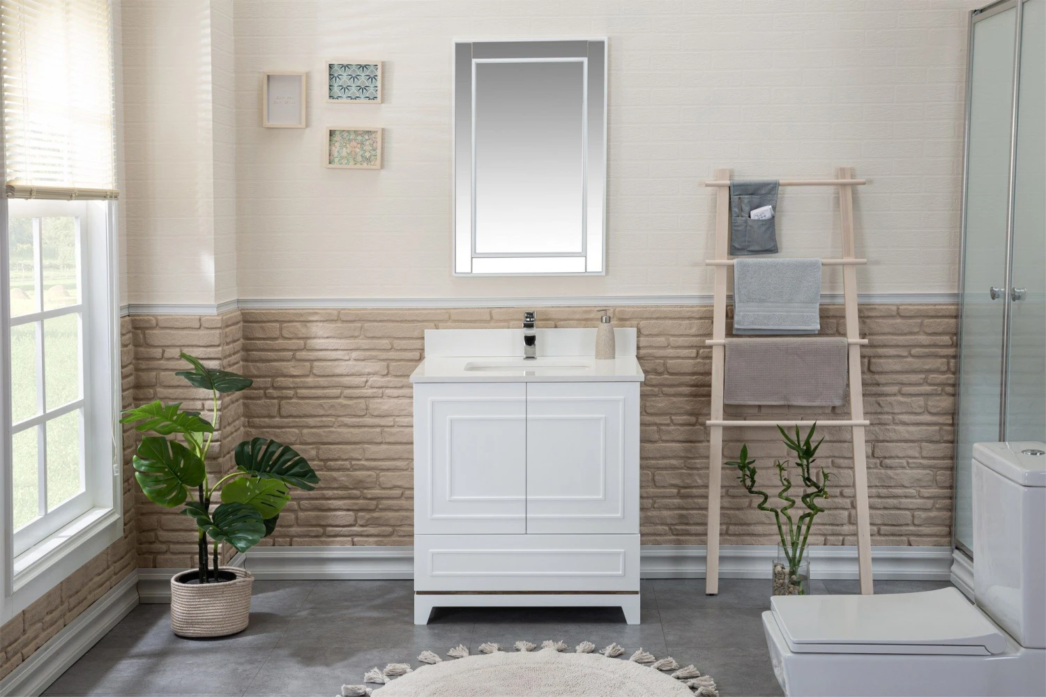 Jussara badkamermeubelset (2-delig) heeft een 100% gelakte MDF constructie met een wit kwarts aanrechtblad, porseleinen wastafel en flotale spiegel.