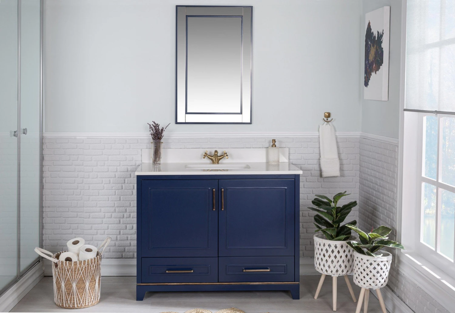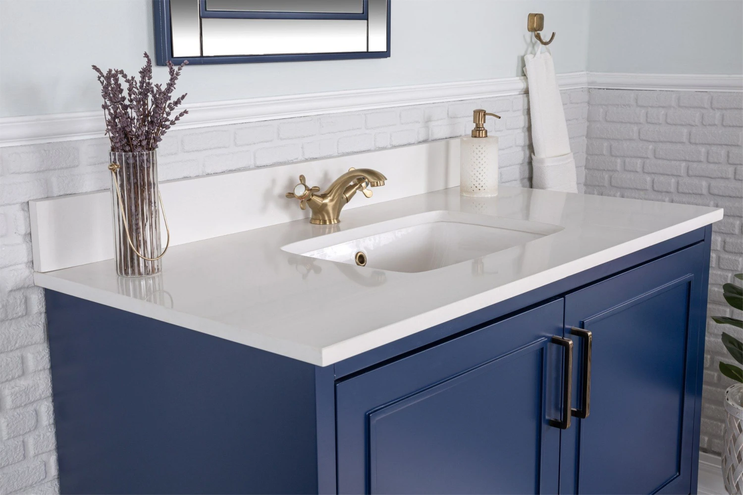 Jussara badkamermeubelset: 2-delige massief houten set met wit kwarts aanrechtblad, onderbouwwastafel, flotale spiegel, bronzen handgrepen en donkerblauwe kleur. Breedte: 105 cm, Hoogte: 22 cm, Diepte: 56 cm. Spiegel: Breedte: 55 cm, Hoogte: 80 cm