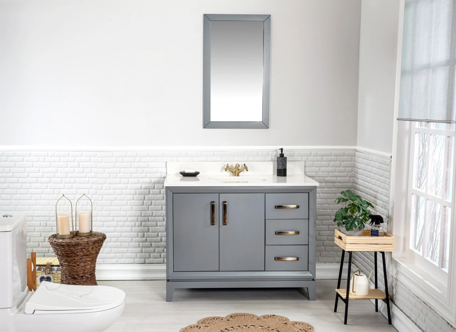 Jussara badkamermeubelset is een 2-delige set gemaakt van 100% gelakt MDF en massief hout. De set bestaat uit een wit kwarts aanrechtblad met een porseleinen onderbouwwastafel en een flotale spiegel met bronzen handgrepen. De afmetingen zijn 105cm breed, 22cm hoog en 56cm diep, met een donkergrijze kleur.