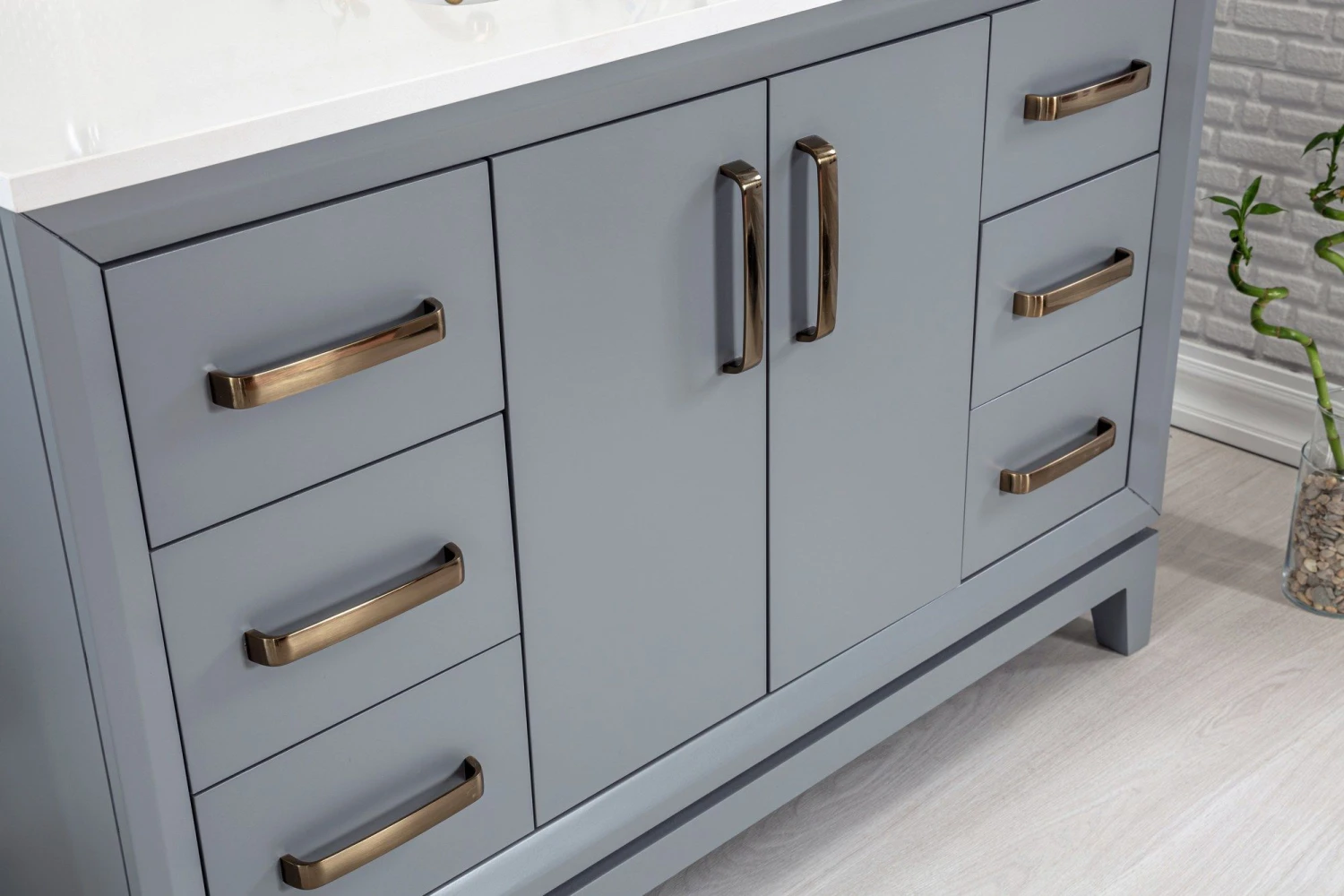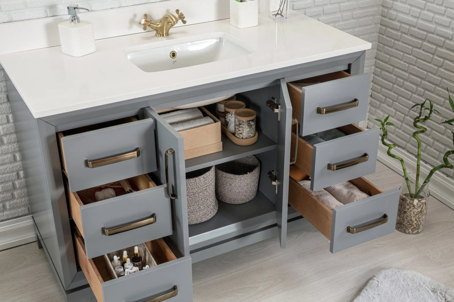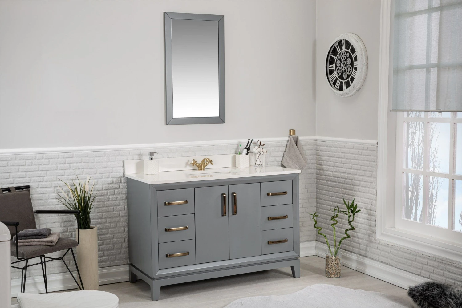 Jussara badkamermeubelset (2-delig) heeft een 100% gelakte MDF constructie, wit kwarts aanrechtblad, porseleinen onderbouwwastafel, zeehouten lade en bronzen handgrepen. De set bestaat uit een badmeubel van 120 cm breed, 22 cm hoog en 56 cm diep en een donkergrijze spiegel van 55 cm breed en 80 cm hoog.