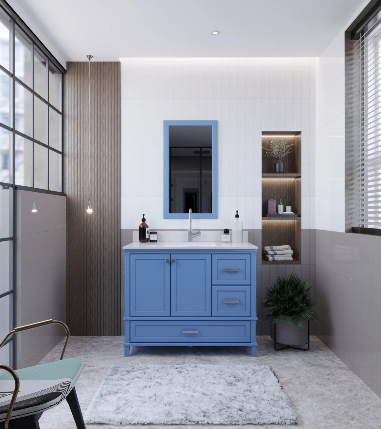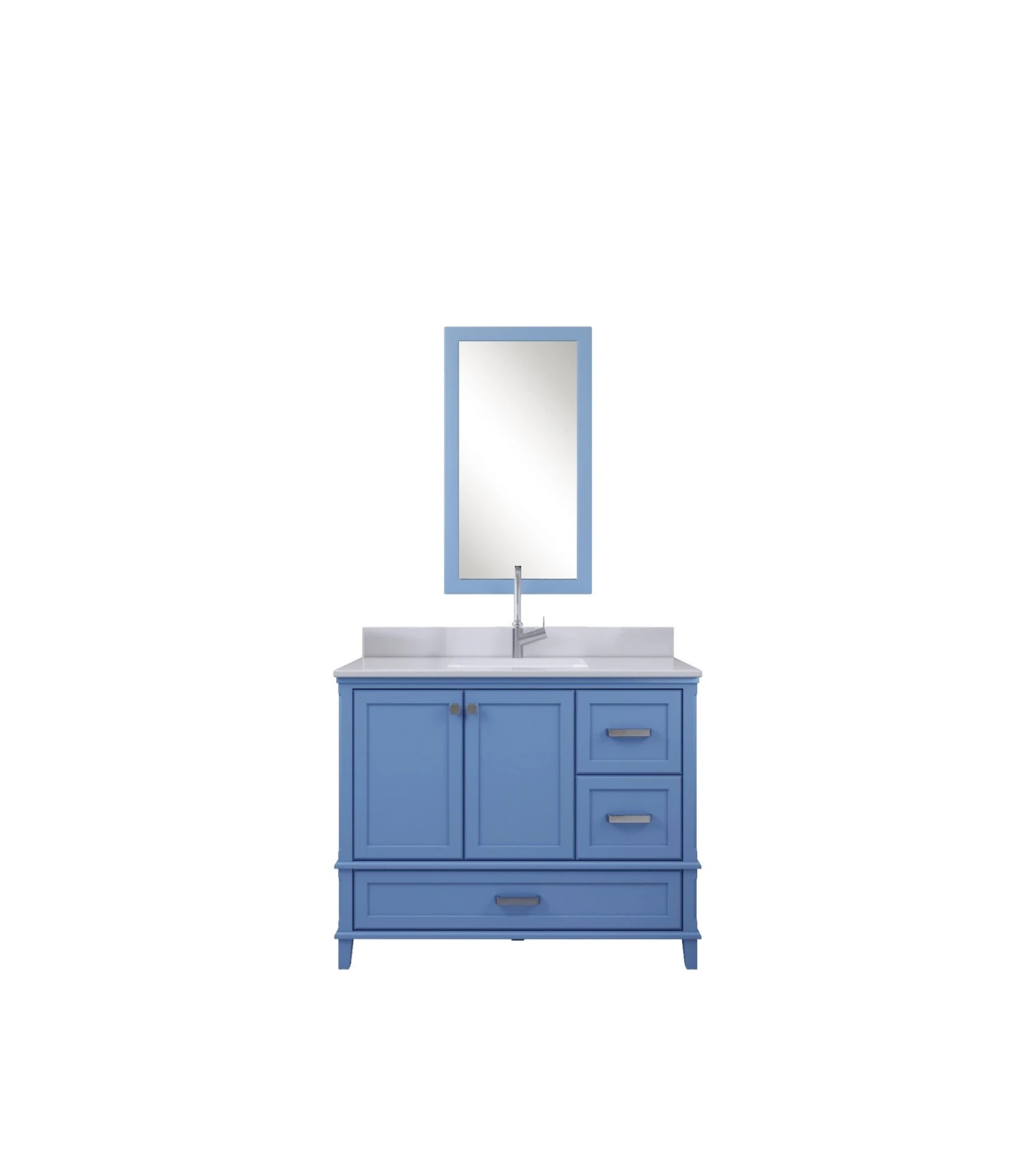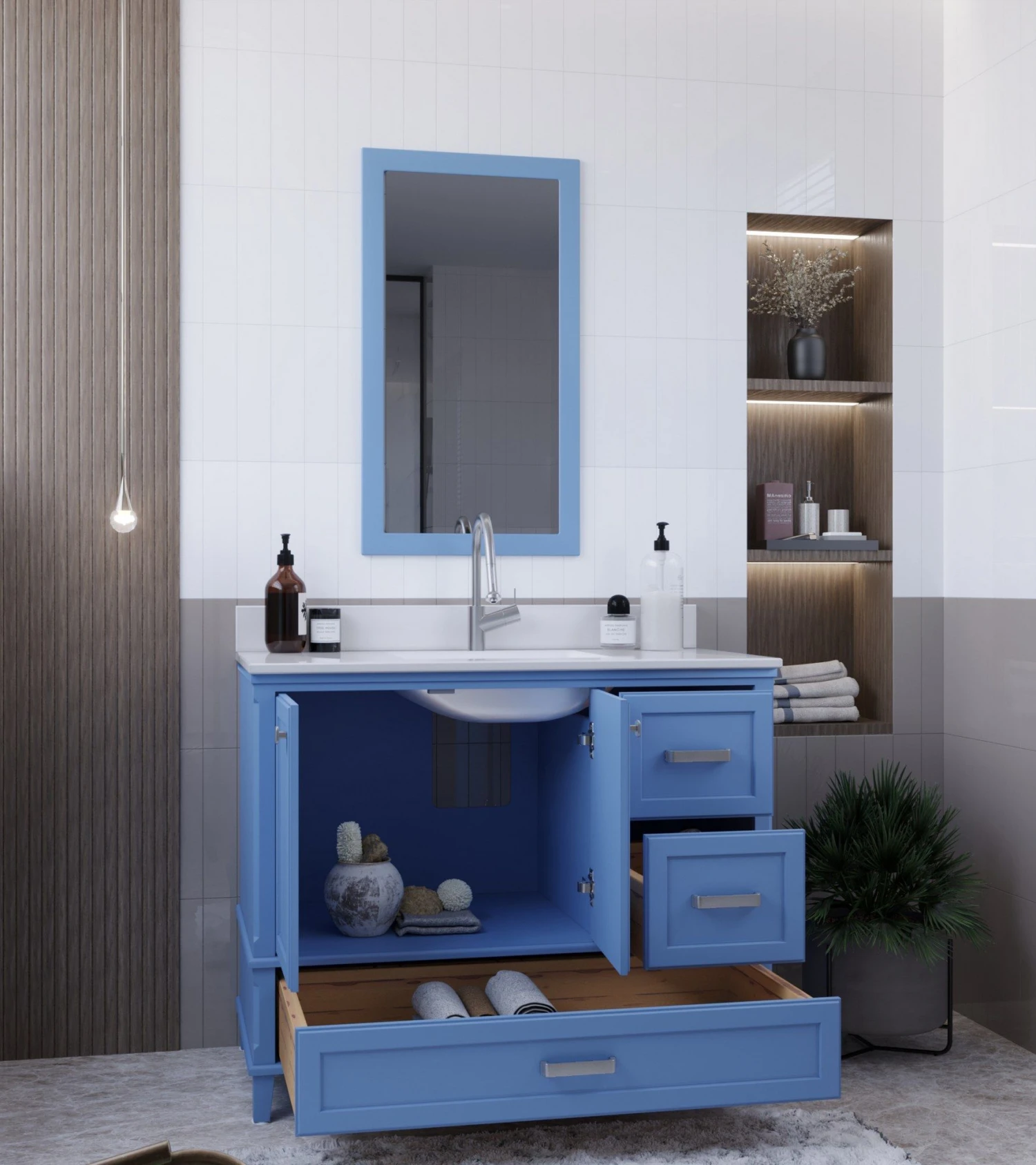 Jussara badkamermeubelset bestaat uit een aanrechtblad met een witte kwarts onderbouwwastafel, een massief houten lade, een zwevende spiegel en chromen handgrepen. Het is gemaakt van duurzame materialen en heeft stijlvolle blauwe kleuraccenten. Afmetingen: 105x22x56 cm voor de set en 55×80 cm voor de spiegel