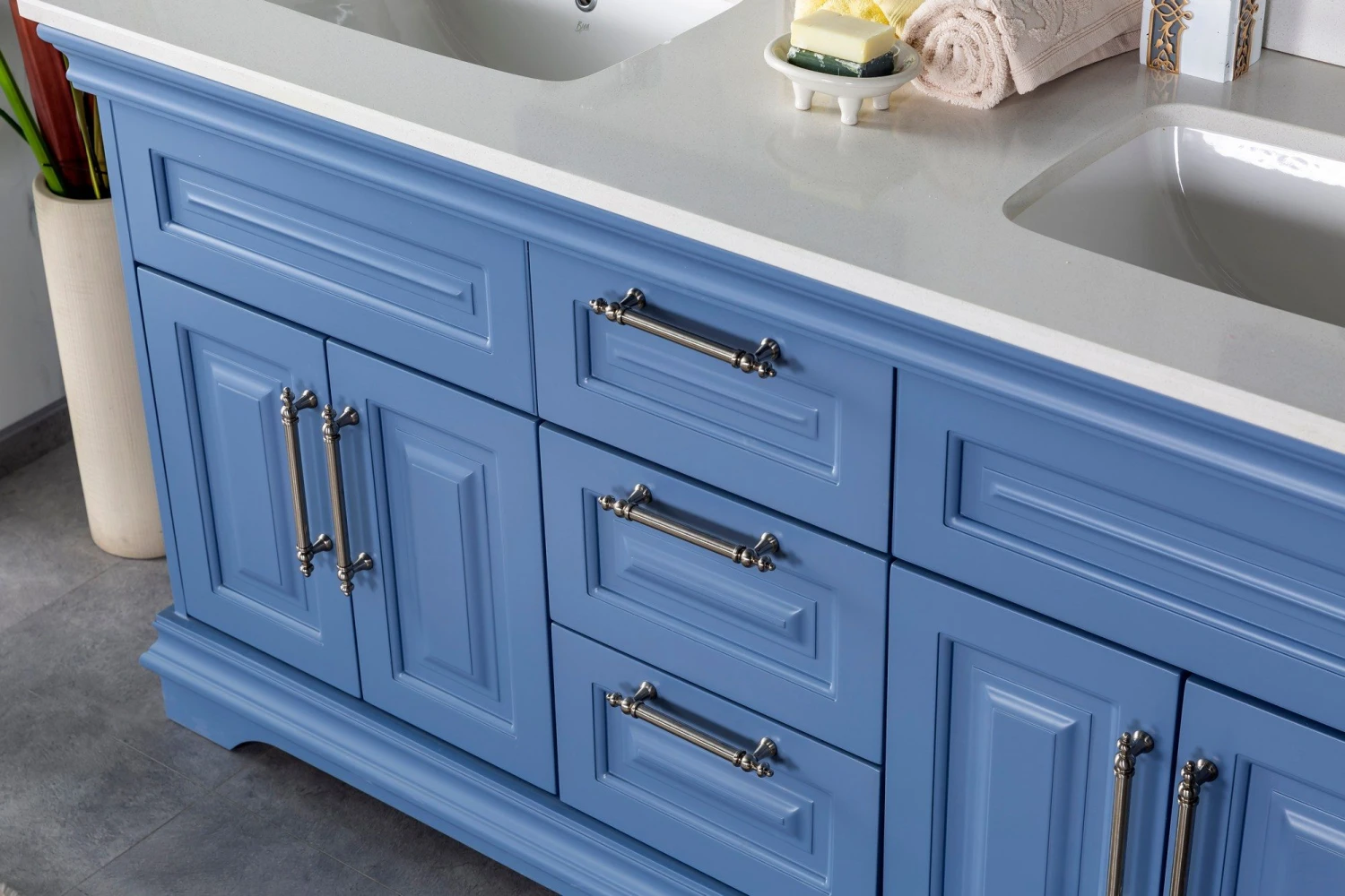 Jussara badkamermeubelset (3-delig) heeft een 100% gelakte MDF constructie, wit kwarts aanrechtblad met porseleinen wastafel, flotale spiegel, zeehouten lade en bronzen handgrepen. De set bestaat uit een blauw badmeubel van 150 cm, 56 cm diep en 22 cm hoog, en een spiegel van 55 cm x 88 cm.