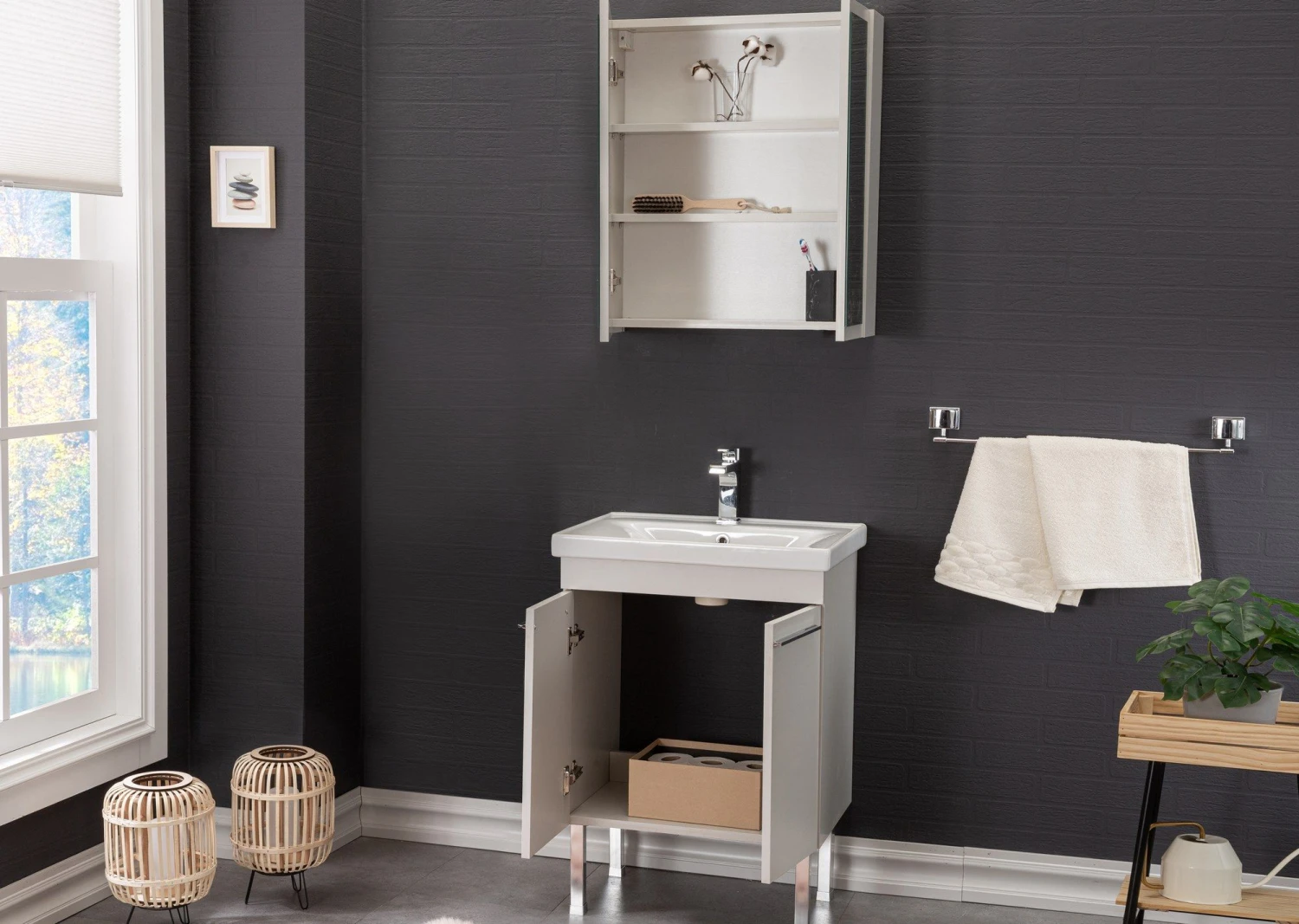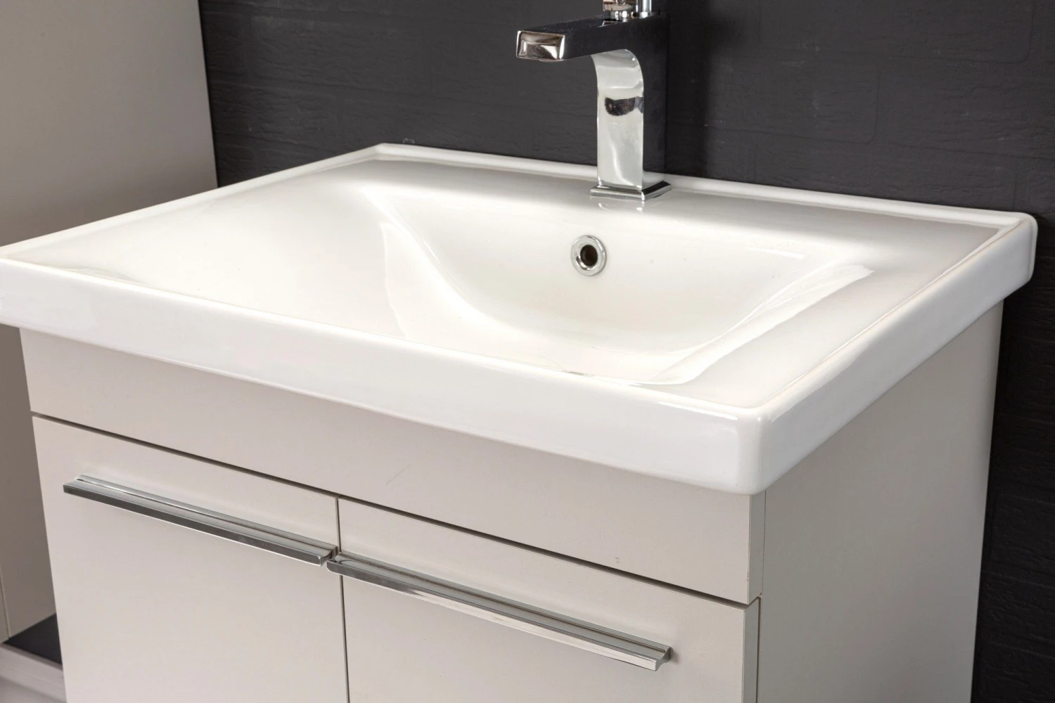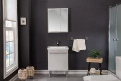 Jussara badkamermeubelset: 100% MDF met melaminecoating en keramische wastafel, verborgen remsysteem, spiegelkast, wandbevestiging, chromen handgrepen, metalen poten. Kast: 59x60x45 cm, Wastafel: 60×16 cm. Wit