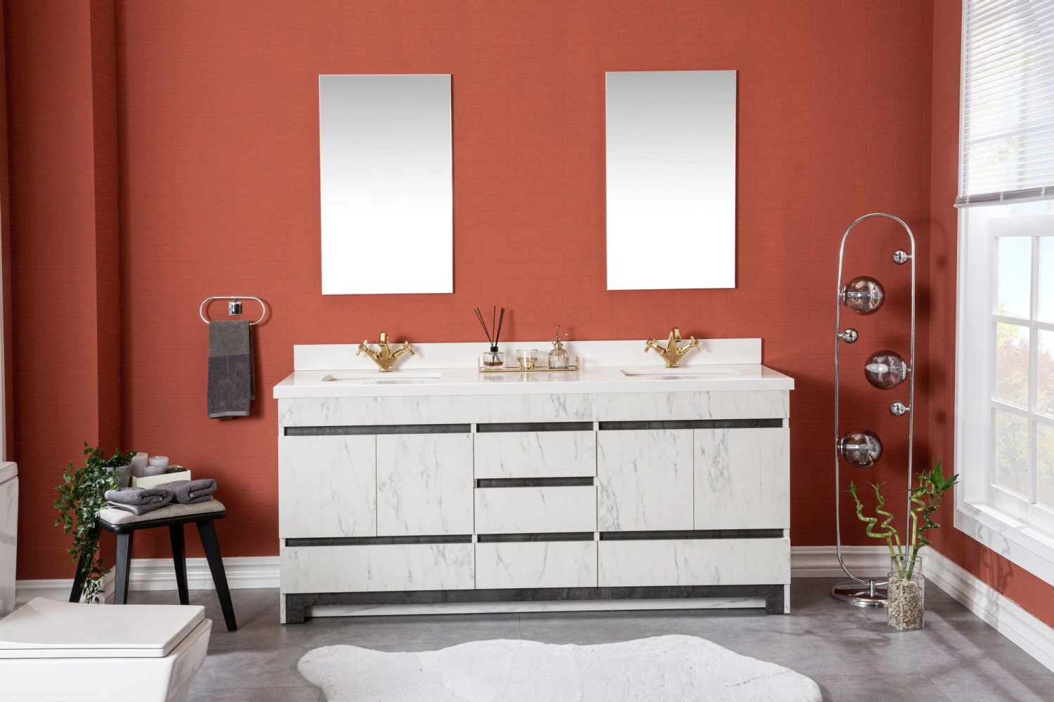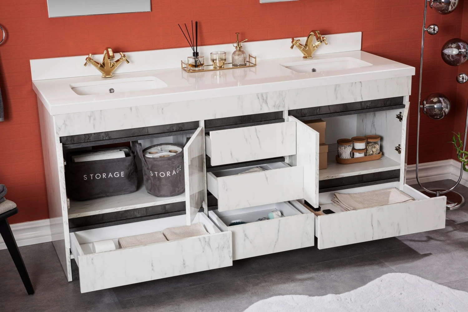 Jussara badkamermeubelset bestaat uit een badmeubel, een aanrechtblad met een kwartswastafel en een marinehouten lade. Het wordt geleverd met een stijlvolle zwart-witte spiegel