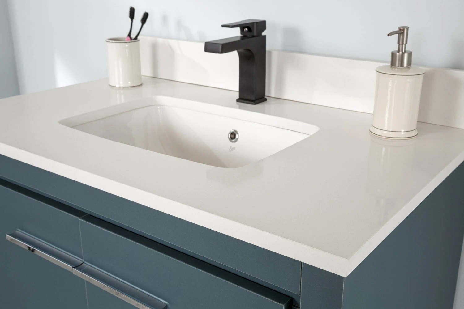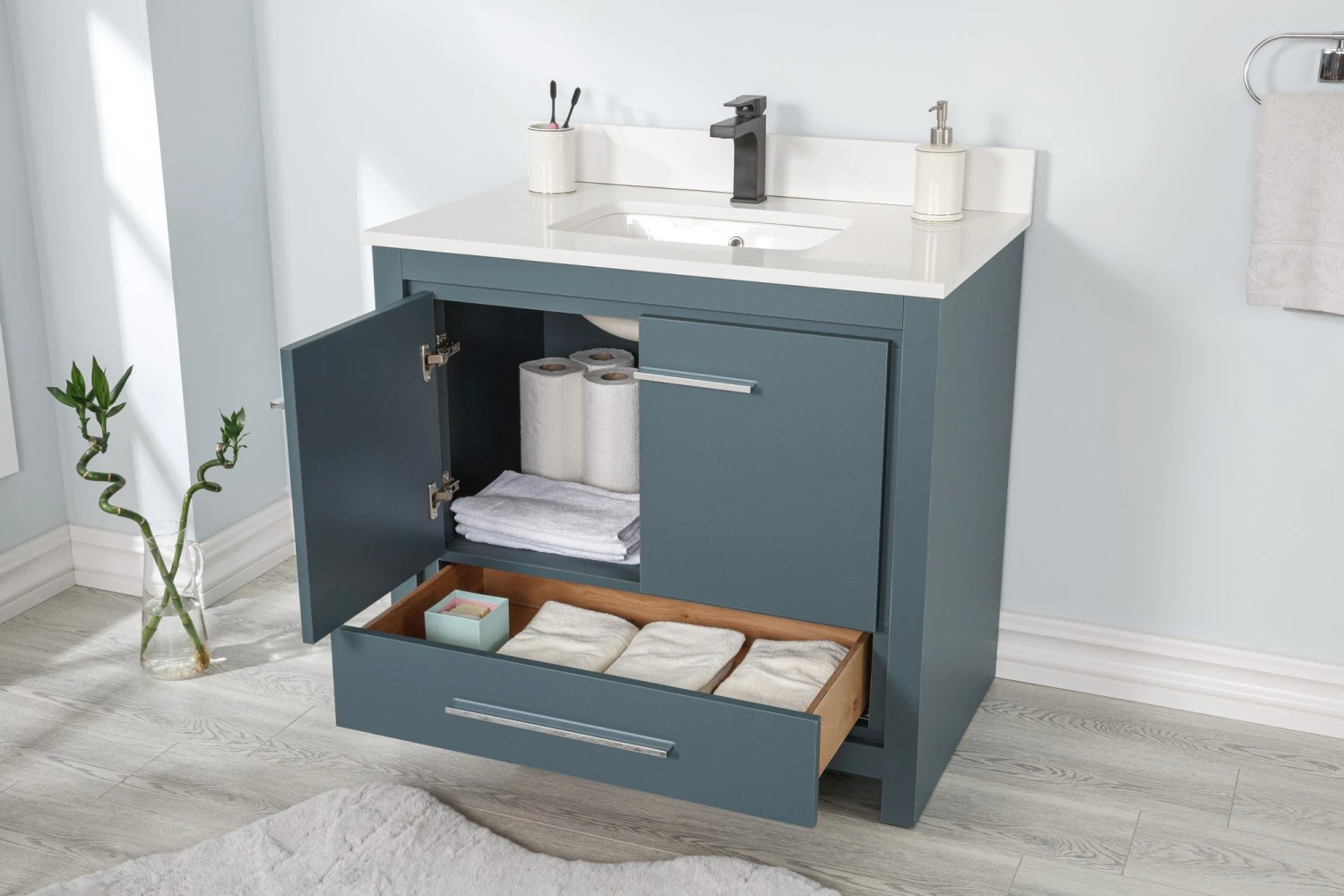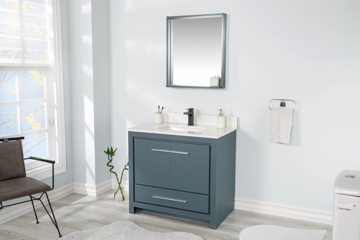 Jussara badkamermeubelset bestaat uit een badmeubel en spiegel, gemaakt van massief hout, met een wit kwartsblad, een marinehouten lade en een blauwe afwerking.