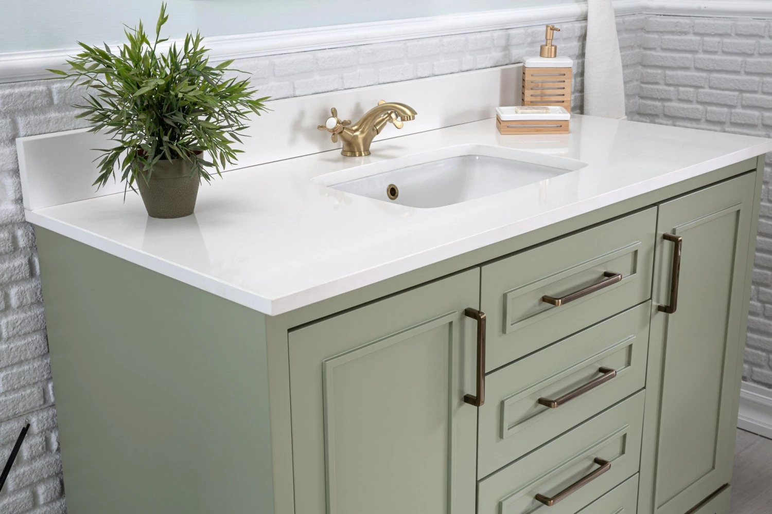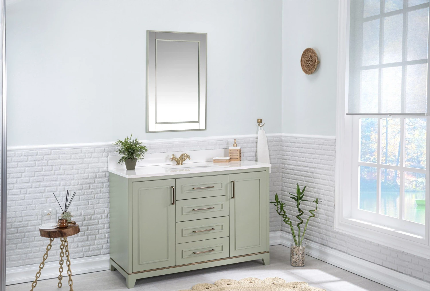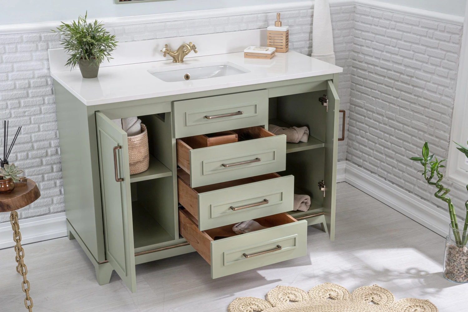 Maak kennis met Jussara badkamermeubelset. Gemaakt van massief hout met gelakt MDF, met een wit kwarts aanrechtblad, onderbouwwastafel, marinehouten lade, flotale spiegel en bronzen handgrepen. Afmetingen: Ijdelheid – 120x22x56 cm, spiegel – 55×80 cm. Stijlvolle groene kleur