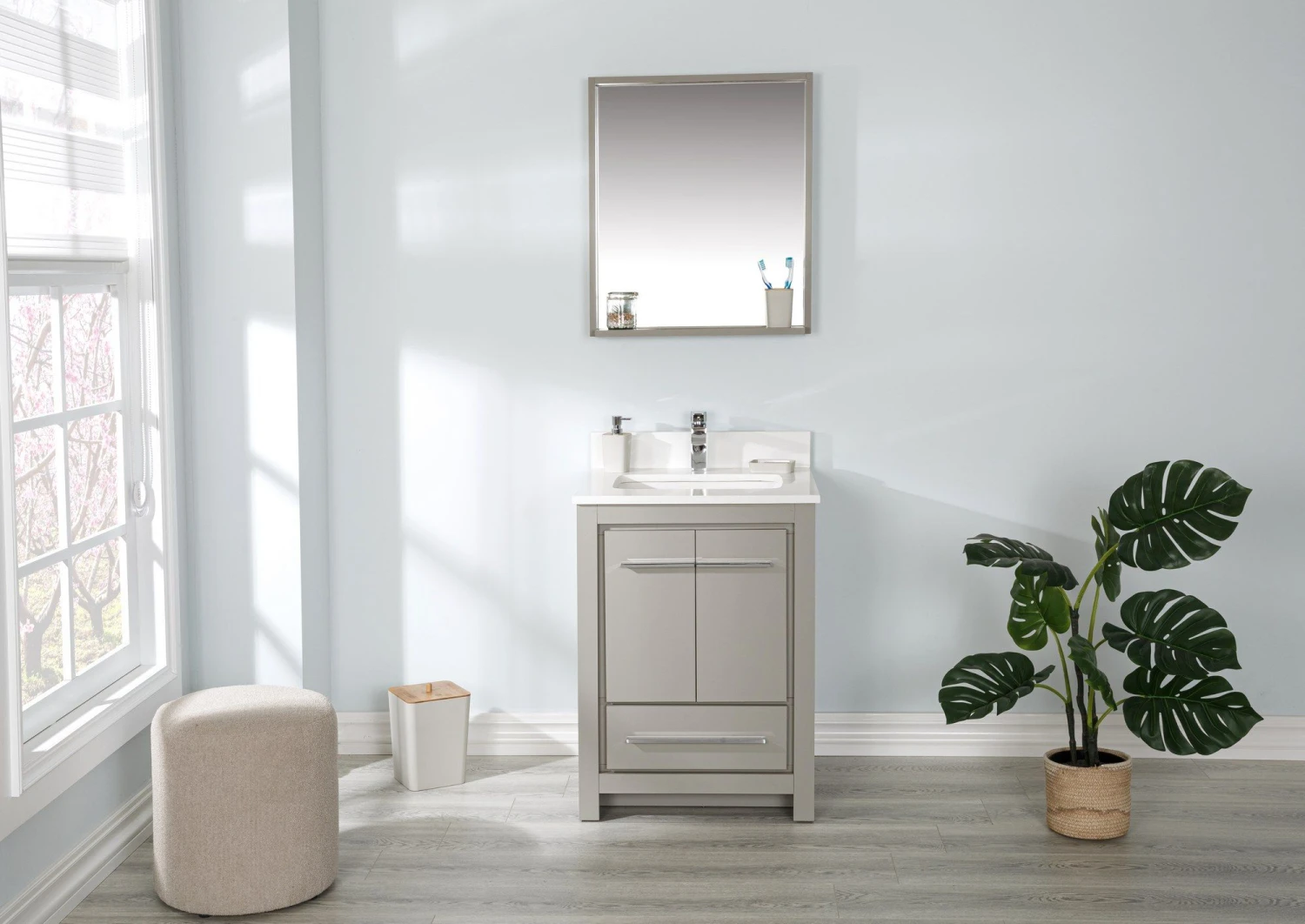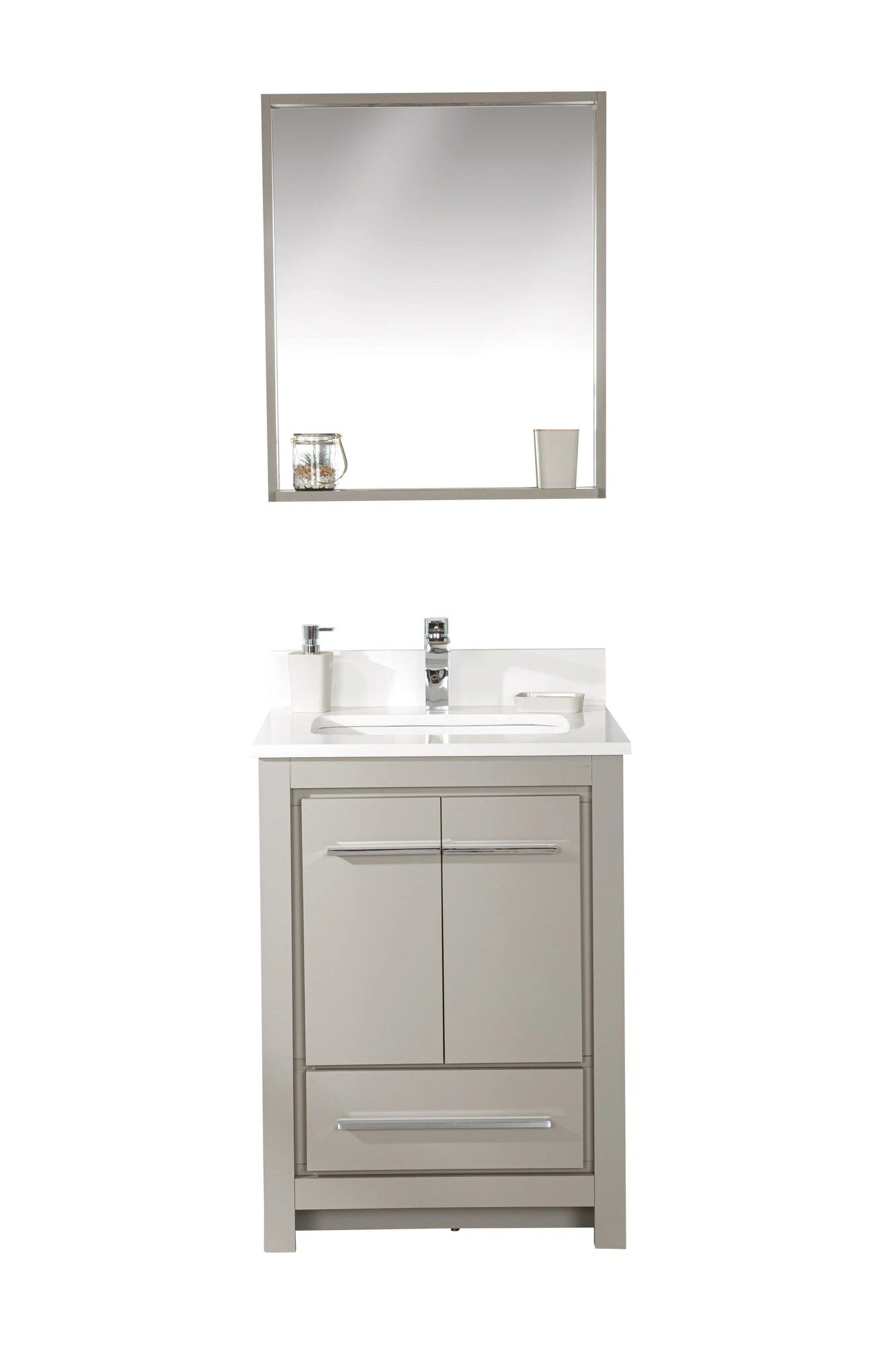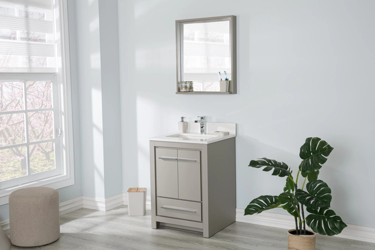 De Jussara badkamermeubelset bestaat uit een badmeubel van 60 cm met een constructie van 100% MDF, een wit kwartsblad, een porseleinen wastafel en een grijze spiegel van 55 cm x 80 cm.