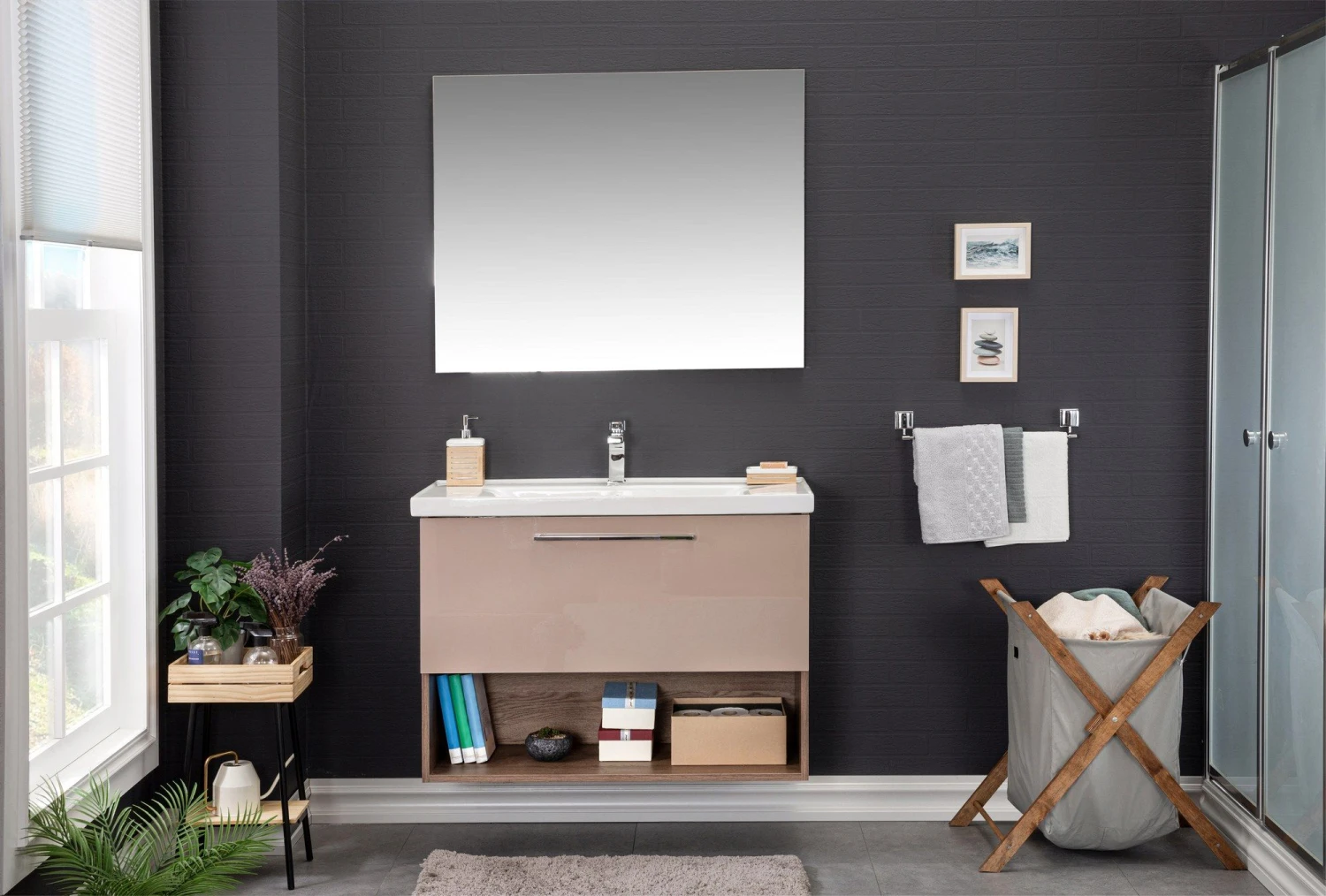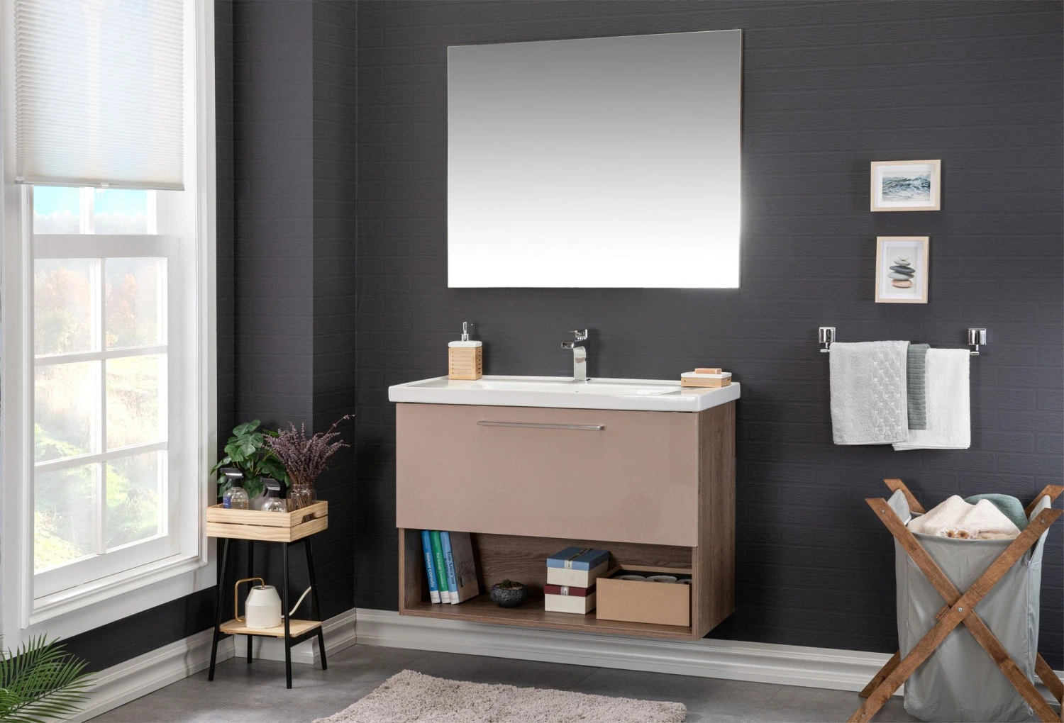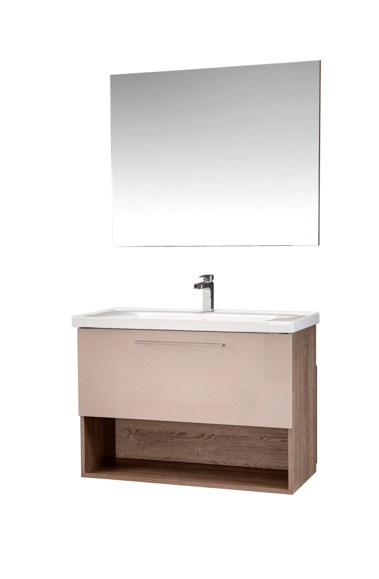 Jussara badkamermeubelset: 100% gemelamineerd MDF met massief hout, keramische wastafel, chromen handgrepen, flotale spiegel, verborgen remsysteem. Kleur: Cappuccino