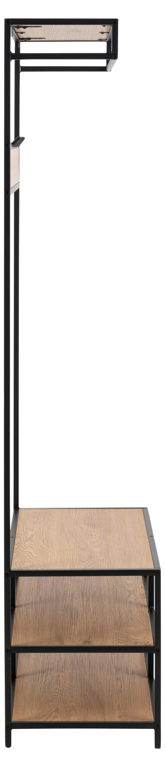 Met de uitgebreide Seaford-collectie tover je in een handomdraai je huis om tot een industrieel paradijs. Zwart en bruin, dé industriële kleuren, zijn volop aanwezig in de meubels uit deze collectie. Deze kapstok heeft bijvoorbeeld een frame uit zwart gepoedercoat metaal en is afgewerkt in wilde-eikdecor. Kapstok Seaford is 185 cm hoog en is uitgerust met 3 legplanken. Daarnaast beschikt hij over 5 ophanghaakjes en een hoedenplank.