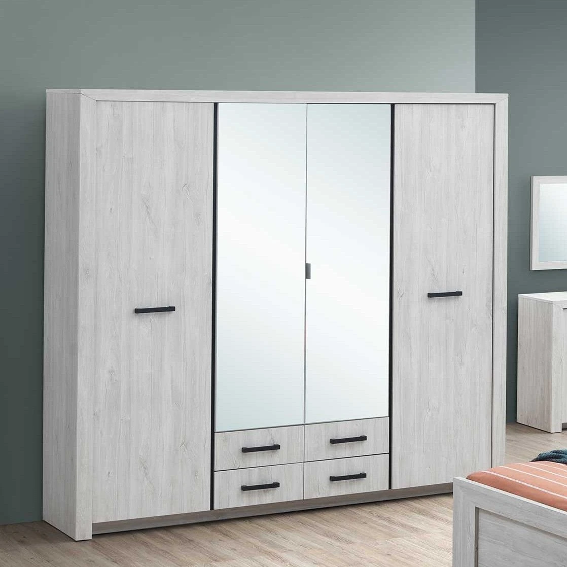 Deze 4-deurskledingkast beschikt over 2 kledingroedes, 8 legplanken en 4 lades. Ideaal voor wie een grote kledingcollectie heeft of om te delen met je partner. De middelste deuren zijn bovendien uitgerust met een lange spiegel waarin je je volledige outfit kan aanschouwen. Combineer met de andere meubelen van de Elvira-collectie en maak jouw slaapkamer compleet!