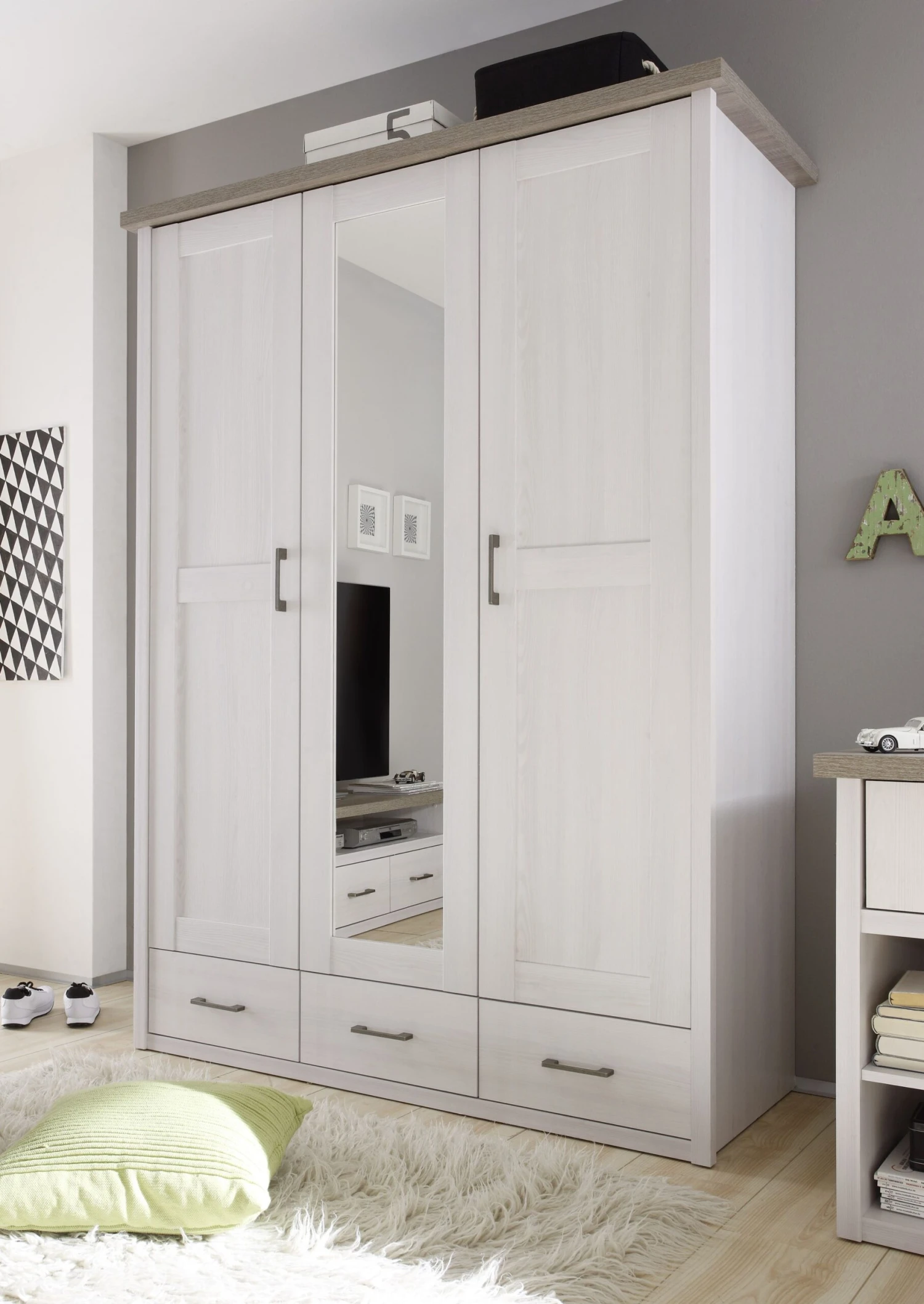 Kledingkast met spiegel Larnaca, uitgerust met 3 deuren & 3 lades en gemaakt uit gefolieerde spaanplaat in pijnboomdecor en accenten in truffelkleur.
