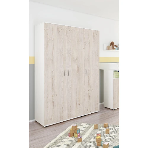 De kastdeuren in eikdecor van kleerkast Halula vormen een prachtig contrast met het wit van de rest van de kast. De kast bestaat uit 3 draaideuren met daarachter 1 kledingroede en 6 legplanken voor de kledij van uw kindje. Deze kleerkast maakt deel uit van de Halula babykamer maar kan ook gemakkelijk gebruikt worden in elke andere babykamer dankzij zijn neutrale ontwerp. Het neutrale ontwerp maakt ook dat u deze kleerkast kunt blijven gebruiken naarmate uw kind ouder wordt. Bekijk ook onze andere meubelen van de Halula babykamer. Schroeven en pluggen voor wandmontage zijn niet inbegrepen.