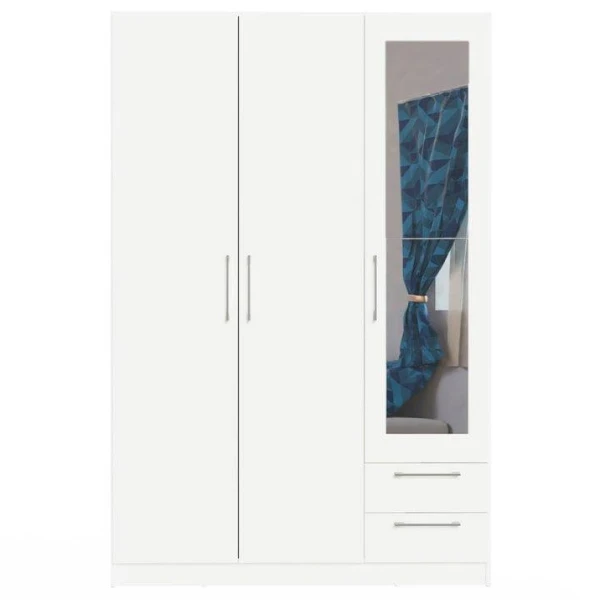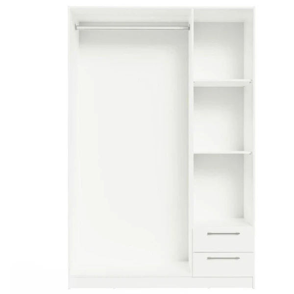 Kleerkast Rhea is gemaakt uit gemelamineerde spaanplaat in wit. De kast bestaat uit 3 draaideuren, 2 legplanken, een kledingroede en 2 lades.