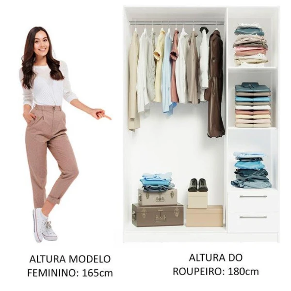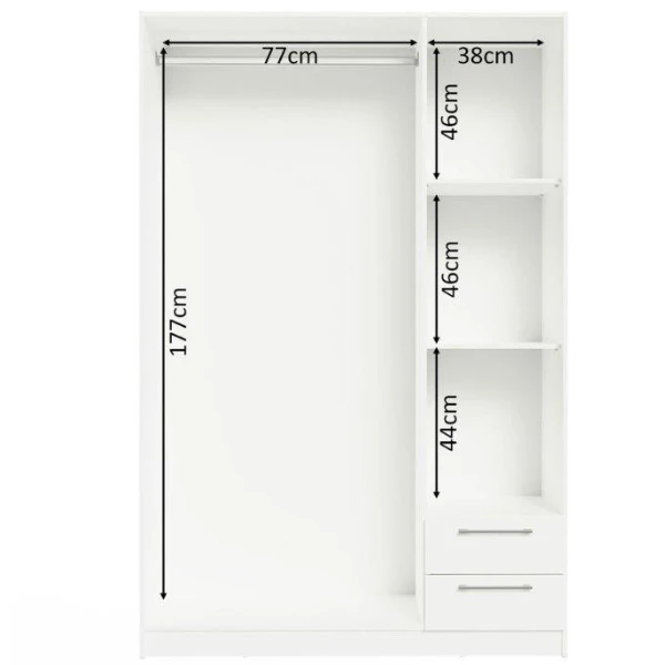 Deze kleerkast zorgt met zijn strakke, witte kleur en spiegel voor veel lichtinval in de kamer. Dankzij zijn neutrale ontwerp vindt hij gemakkelijk zijn weg in de meeste interieurs. De kast beschikt over 2 legplanken, een kledingroede en 2 lades waarin u kousen en ondergoed of beddengoed kunt steken. Onder de kledingroede onderaan de kast is er eventueel nog plaats voor wat handtassen en schoenendozen. In de handige spiegel kunt u uw outfit nog controleren alvorens u de deur uitgaat.