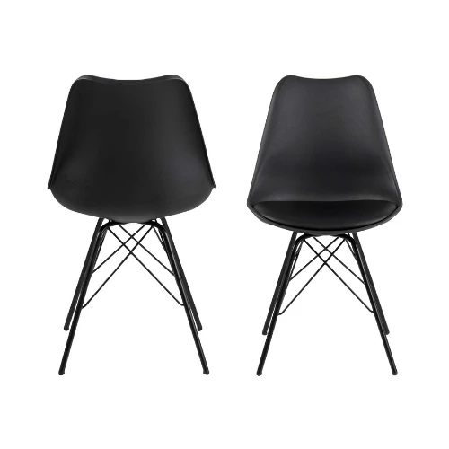 De zwarte Irma kuipstoel is gemaakt van kunststof en uitgerust met een zitkussen uit kunstleder. De poten van de stoel zijn uit wit gepoedercoat metaal. Deze stoel past perfect voor jouw eetkamer of keuken, als je houdt van de Scandinavische woonstijl.