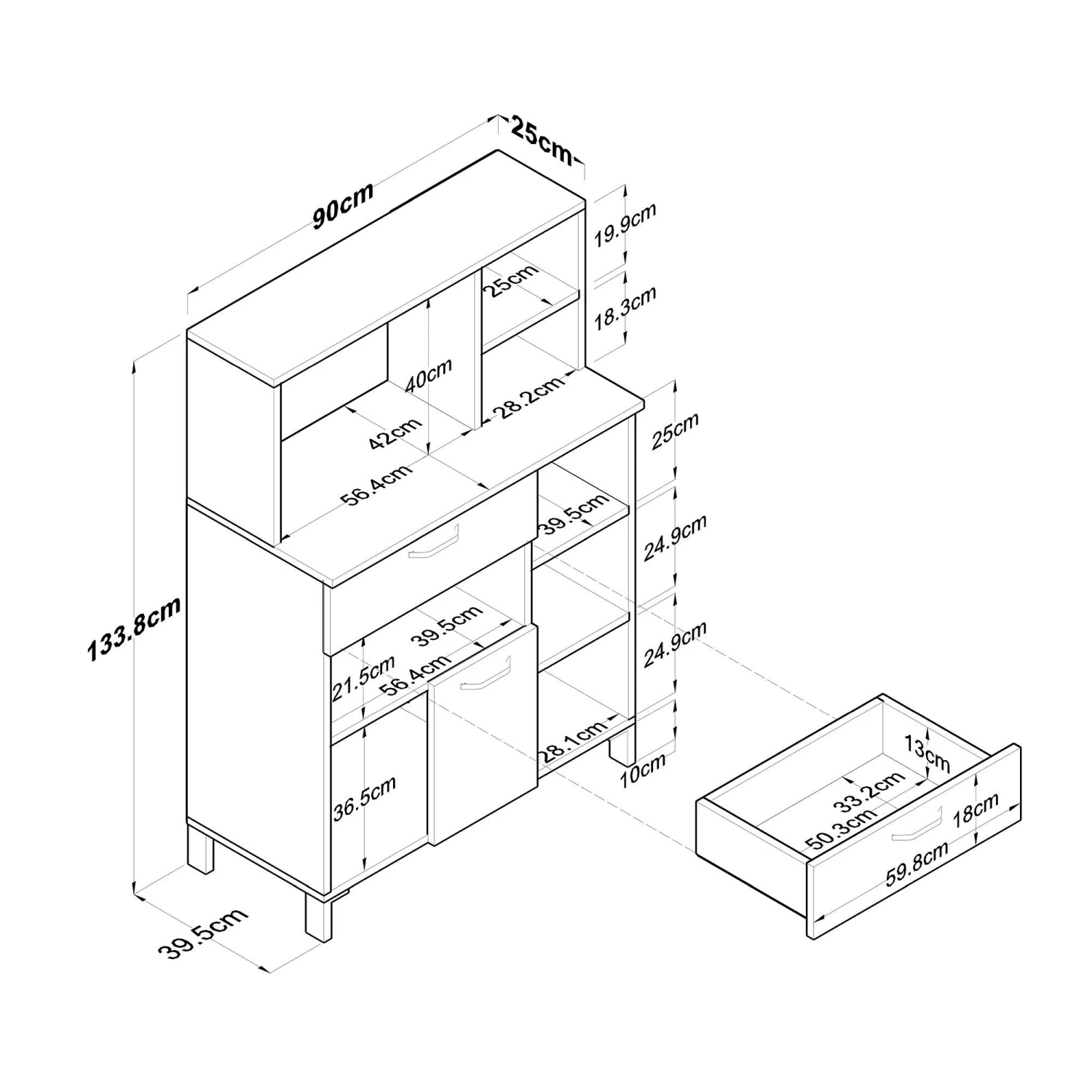 Met zijn royale afmetingen van 90 cm in de breedte en 133 cm in de hoogte biedt deze kast voldoende opbergruimte voor al je benodigdheden. In het ruime interieur kun je van alles opbergen, van kleding en accessoires tot huishoudelijke artikelen en kantoorbenodigdheden. Zeg vaarwel tegen rommelige ruimtes en hallo tegen georganiseerde gelukzaligheid met de Locelso multifunctionele kast.