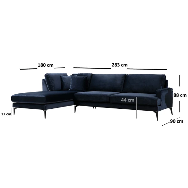 De hoekbank is een comfortabele en stijlvolle toevoeging aan elke woonkamer. Hij heeft een frame van beukenhout en spaanplaat, een stof van 100% polyester en een marineblauwe kleur. Het schuim is zacht grijs voor het zitten en snipperschuim/siliconen schuim voor de rug en kussens. De bank wordt ook geleverd met draagbare zit- en rugkussens, stof die chemisch gereinigd kan worden en matzwarte metalen poten. De afmetingen zijn 283 x 180 cm in lengte, 90 cm in breedte en 88 cm in hoogte.