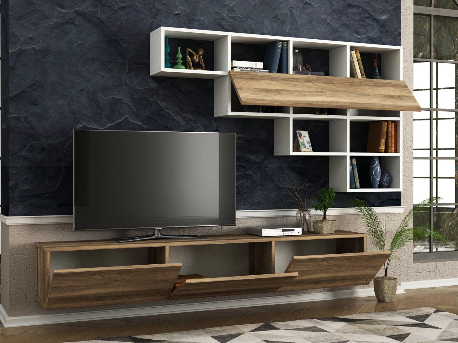 Shop ons moderne tv-meubel gemaakt met gemelamineerde spaanplaat voor een strakke look. Het biedt voldoende ruimte voor je tv en decoraties. Kan aan de muur worden bevestigd. Kleur: Wit walnoot