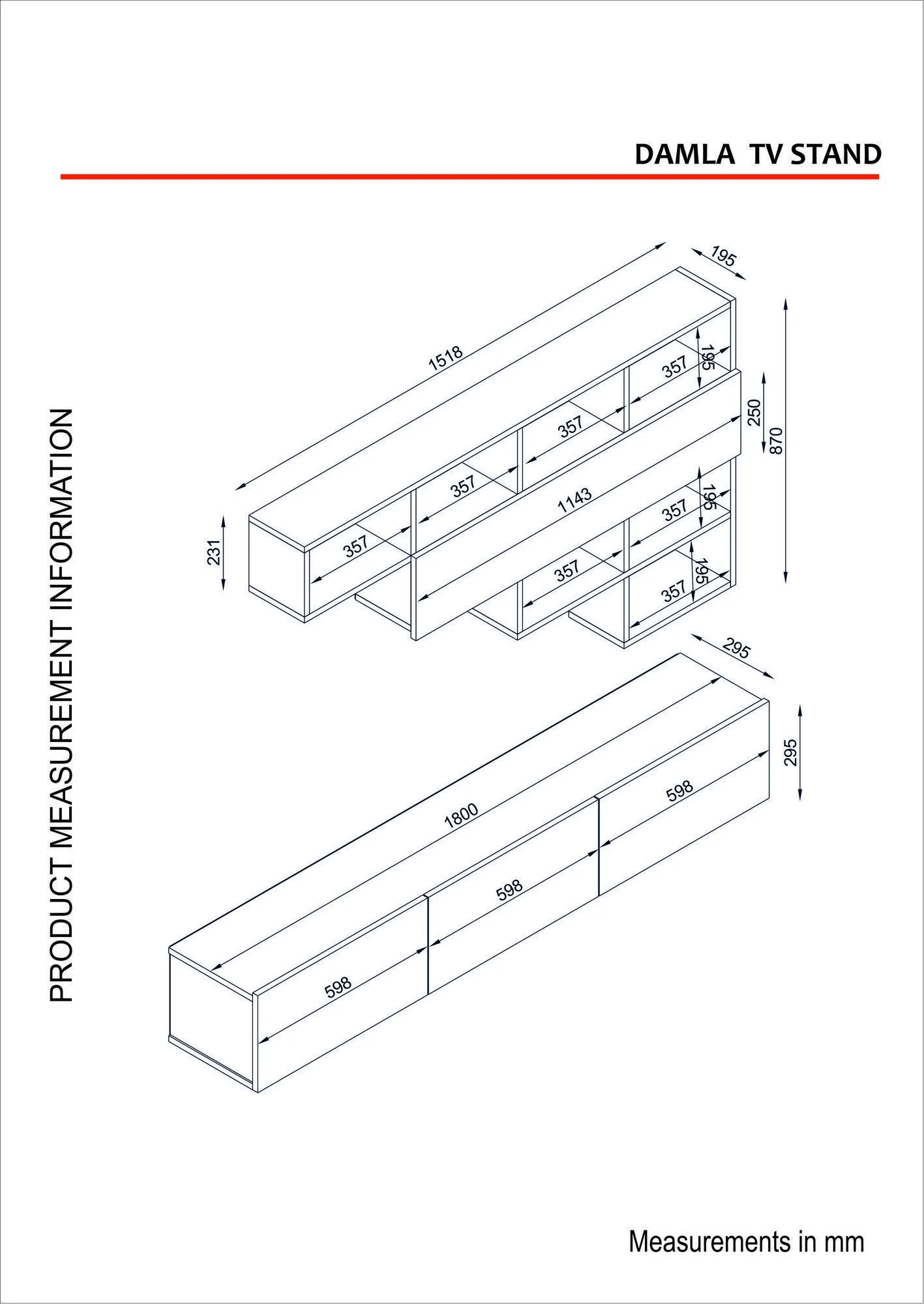 Ben je de oude look in je woonkamer beu? Wil je een vleugje modern design aan je huis toevoegen? Zoek dan niet verder! Onze collectie TV-meubels biedt de perfecte oplossing om je woonruimte opnieuw in te richten en te verbeteren. Een van de belangrijkste kenmerken van ons tv-meubel is het materiaal waarvan het gemaakt is – gemelamineerde spaanplaat met een dikte van 18 mm. Dit zorgt voor duurzaamheid en stevigheid, waardoor het een duurzame investering voor je huis is. Het TV-meubel biedt niet alleen een stijlvol platform voor je TV, maar biedt ook voldoende ruimte voor extra spullen zoals decoraties, planten of zelfs je favoriete boeken. Je kunt nu een mooie, georganiseerde display creëren die je persoonlijke stijl en smaak weerspiegelt. De afmetingen van het TV-meubel zijn zorgvuldig ontworpen om naadloos in elke woonkamer te passen. Het TV-meubel heeft een royale breedte van 180 cm, een hoogte van 29,5 cm en een diepte van 29,5 cm. Dit biedt genoeg ruimte voor de meeste tv-formaten, zodat hij perfect past bij je entertainmentbehoeften. Naast de TV-standaard bevat onze collectie ook een wandplank die het meubel perfect aanvult. De totale afmeting van de wandplank is 151,8 cm in de breedte, 87 cm in de hoogte en 19,5 cm in de diepte. Dit biedt voldoende ruimte om je favoriete items uit te stallen en voegt tegelijkertijd een esthetische aantrekkingskracht toe aan je woonkamer. De wandplank bestaat uit drie afzonderlijke planken, elk met hun eigen afmetingen. De bovenste plank heeft een breedte van 151,8 cm, een hoogte van 19,5 cm en een diepte van 19,5 cm, zodat je je meest dierbare items kunt uitstallen. De middelste plank is 114,3 cm breed, 25 cm hoog en 19,5 cm diep en biedt ruimte voor extra decoraties of opslag. De onderste plank is ontworpen met een breedte van 35,7 cm, een hoogte van 19,5 cm en een diepte van 19,5 cm, zodat je de ruimte optimaal kunt benutten. Een van de opvallendste kenmerken van ons TV-meubel is zijn veelzijdigheid. Het kan eenvoudig aan de muur worden bevestigd, waardoor het een ruimtebesparende en stabiele optie is voor elke woonkamer. Hierdoor hoef je je geen zorgen te maken dat je TV per ongeluk omvalt of verschuift, zodat je TV en spullen veilig staan. Bovendien biedt ons tv-meubel veel opbergmogelijkheden, zodat je je woonkamer rommelvrij kunt houden. Of het nu