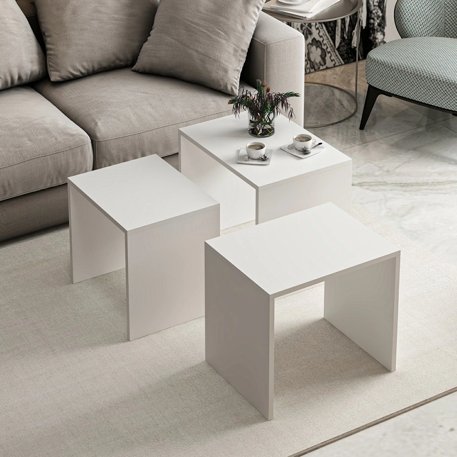 De tafels zijn ontworpen in een tijdloze witte kleur die moeiteloos bij elk interieur past. Door de neutrale tint passen ze naadloos bij bestaande meubelstukken en voegen ze een vleugje elegantie toe aan elke kamer.