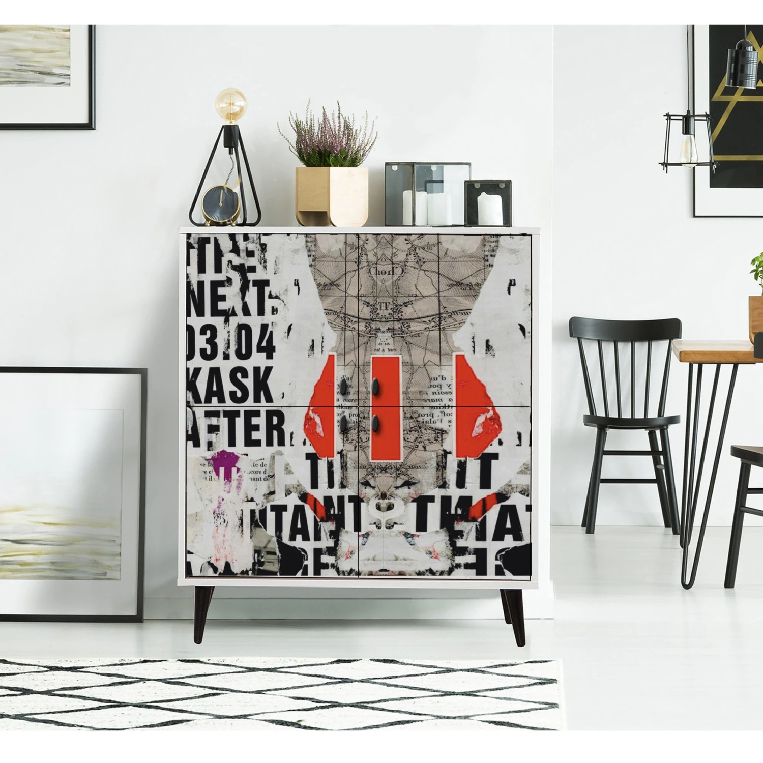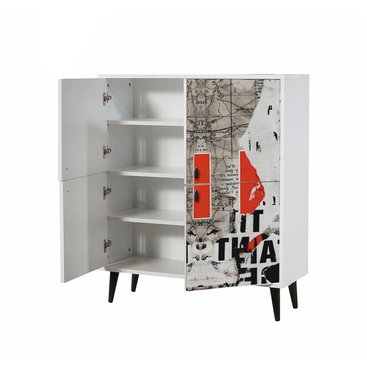 Vella: Een strakke en veelzijdige multifunctionele kast gemaakt van 100% gemelamineerd spaanplaat met haagbeuken poten, metalen en touw handgrepen. Verkrijgbaar in wit, zwart, rood en grijs. Breedte: 95cm, Hoogte: 111cm, Diepte: 36cm, Hoogte legplanken: 19cm