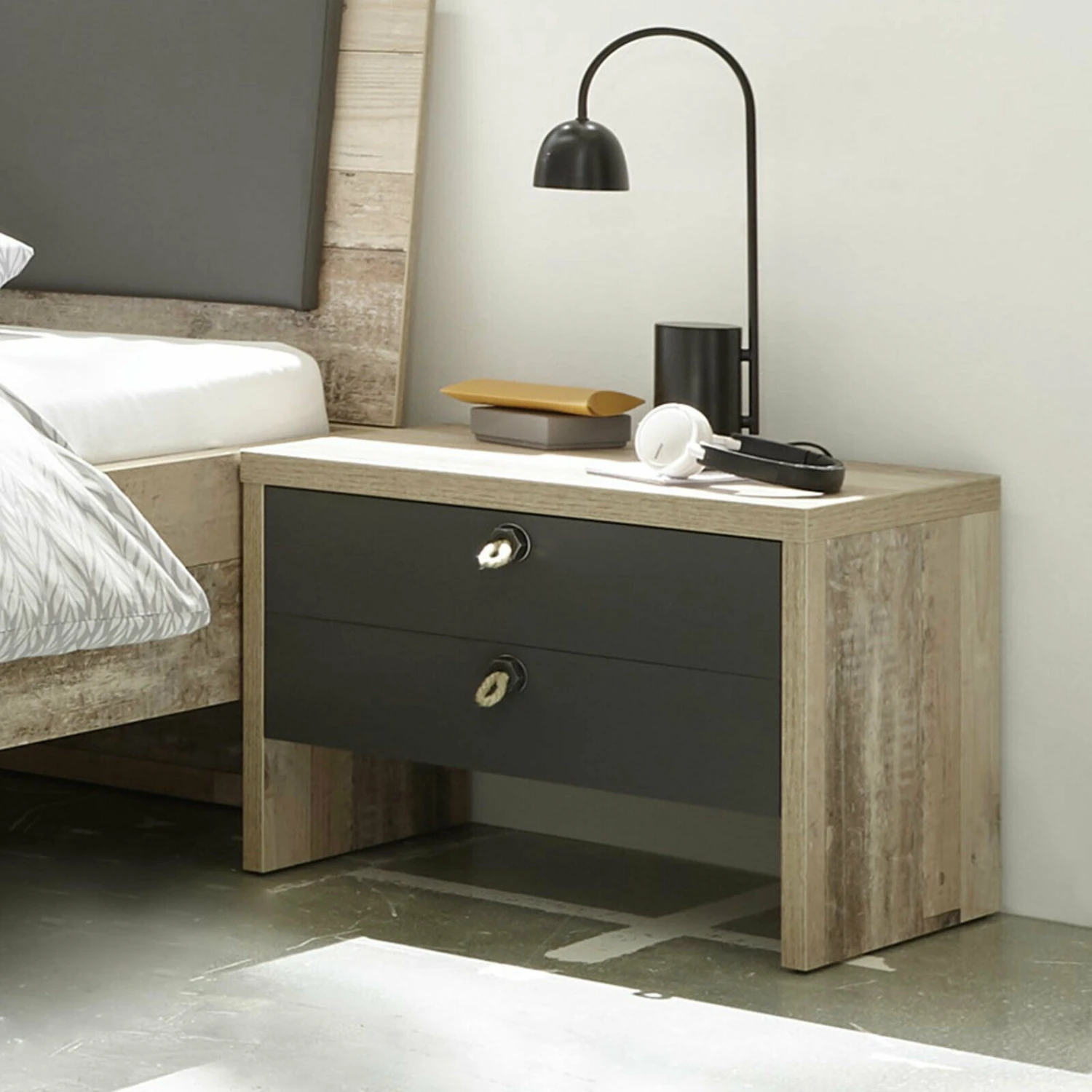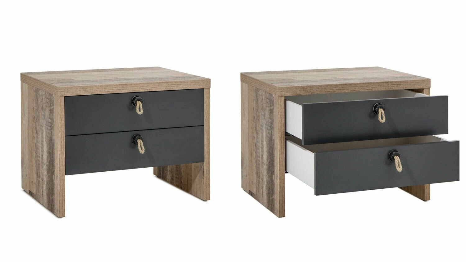 Nachtkastje Moleskin met 2 lades, gemaakt uit spaanplaat in een decor van lichte eik, lades in antracietkleur en decoratieve handgrepen in touw.