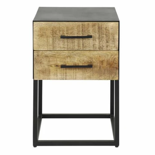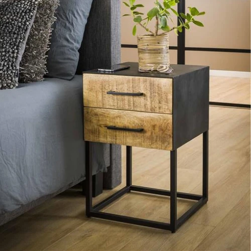Metalen nachtkastje Weta heeft 2 lades in mangohout en is 60 cm hoog.