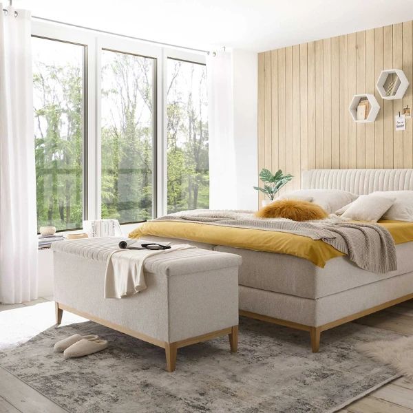 Ga helemaal op in de “hygge”-trend met de collectie Arhus. Deze opbergkoffer is gemaakt uit spaanplaat en is bekleed met crèmekleurig polyester. De houten pootjes zorgen voor een warm accent. De koffer biedt handige opbergruimte voor kussens, dekens of andere spullen. De zachte schuimvulling in het deksel zorgt ervoor dat je de koffer ook kunt gebruiken als extra zitplaats. Combineer hem met de boxsprings Arhus in de slaapkamer, of gebruik hem als halbankje.