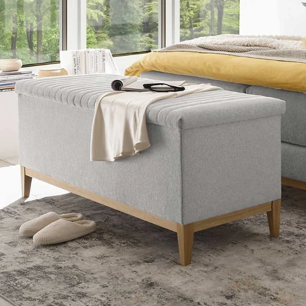 Ga helemaal op in de “hygge”-trend met de collectie Arhus. Deze opbergkoffer is gemaakt uit spaanplaat en is bekleed met grijs polyester. De houten pootjes zorgen voor een warm accent. De koffer biedt handige opbergruimte voor kussens, dekens of andere spullen. De zachte schuimvulling in het deksel zorgt ervoor dat je de koffer ook kunt gebruiken als extra zitplaats. Combineer hem met de boxsprings Arhus in de slaapkamer, of gebruik hem als halbankje.