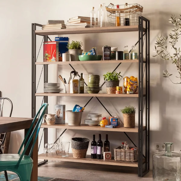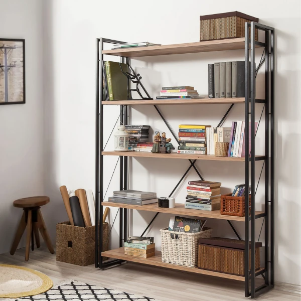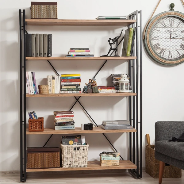 Boekenkast Fantine is gemaakt uit gemelamineerde spaanplaat met Atlantische pijnboomdecor en heeft een zwarte metalen frame en 5 legplanken.
