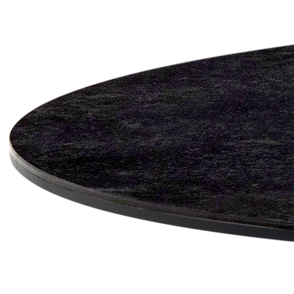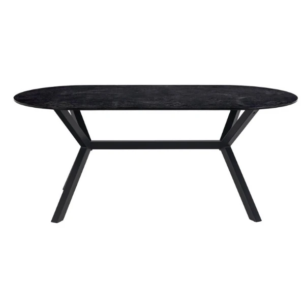 Ovalen eettafel Laxey, met tafelblad in keramiek en glas, onderstel in mat zwart gepoedercoat metaal.