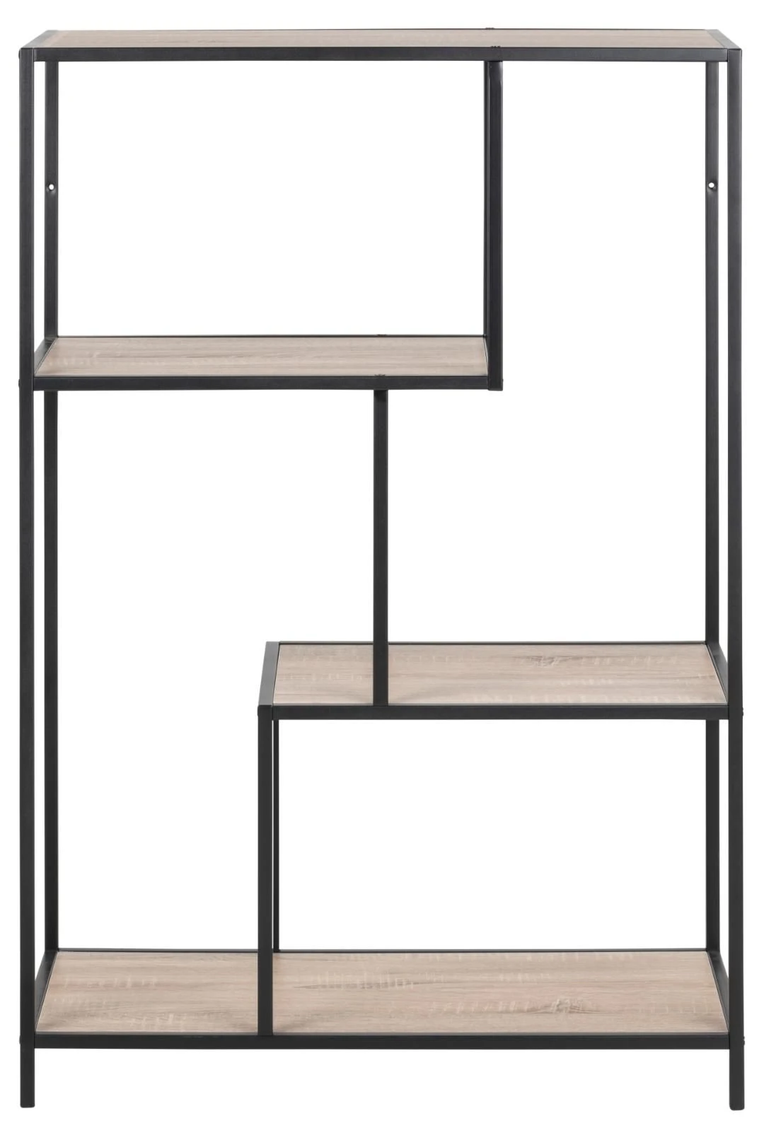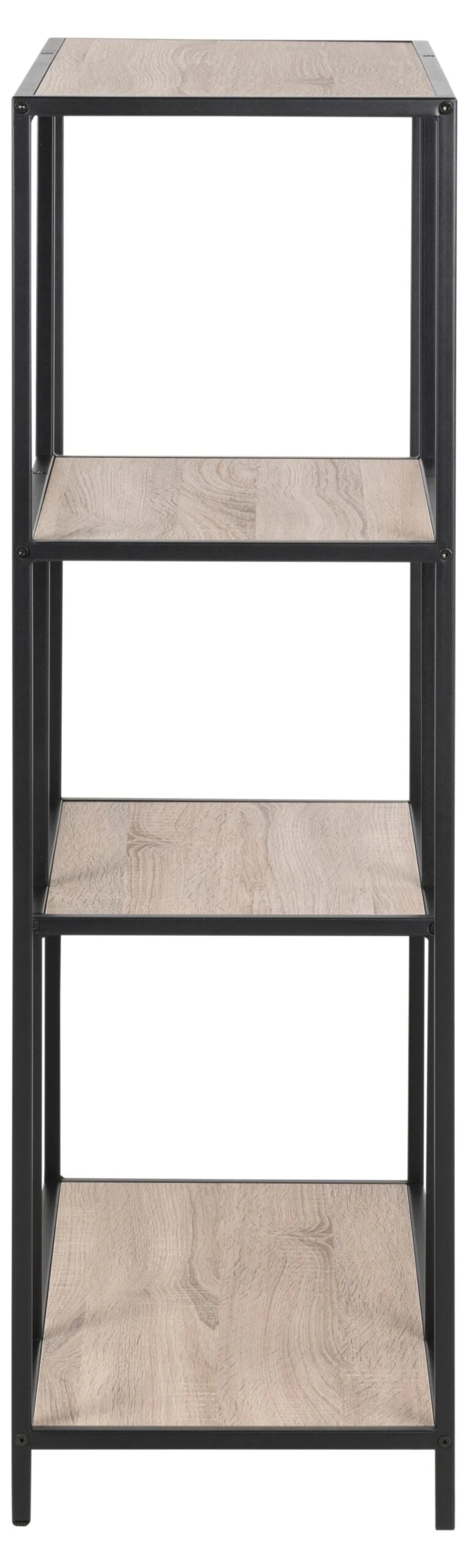 Met de meubelen uit de Dover collectie richt je je huis in volgens de laatste trends. Dit decoratieve rek heeft een frame uit zwart gepoedercoat metaal en legplanken met een Sonoma eik decor. In dit rekje kun je boeken en andere objecten een mooi plaatsje geven.