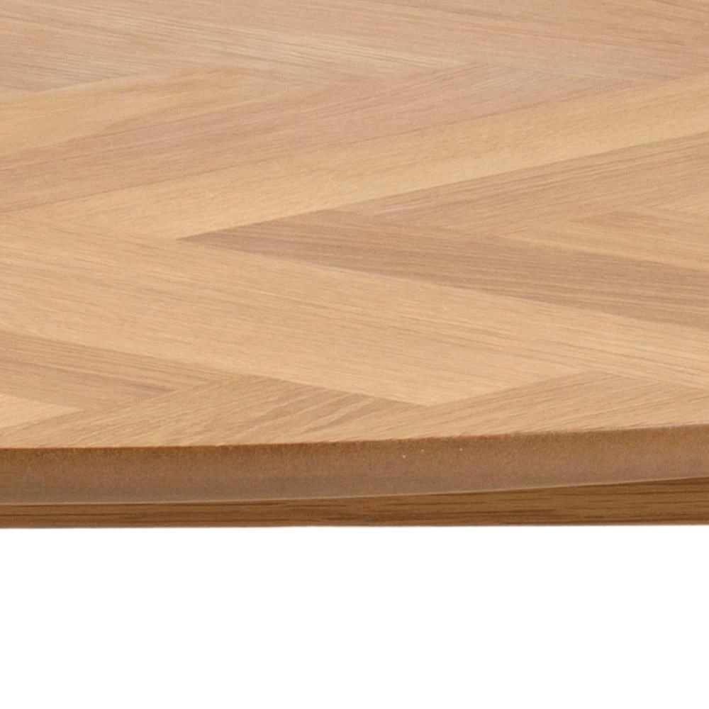 Deze Nalini eettafel is rond en bedraagt een diameter van 120 cm. Het tafelblad heeft een prachtig visgraat effect in eikfineer. Bekijk ook de andere meubelen van de Nalini-collectie voor een mooi geheel.