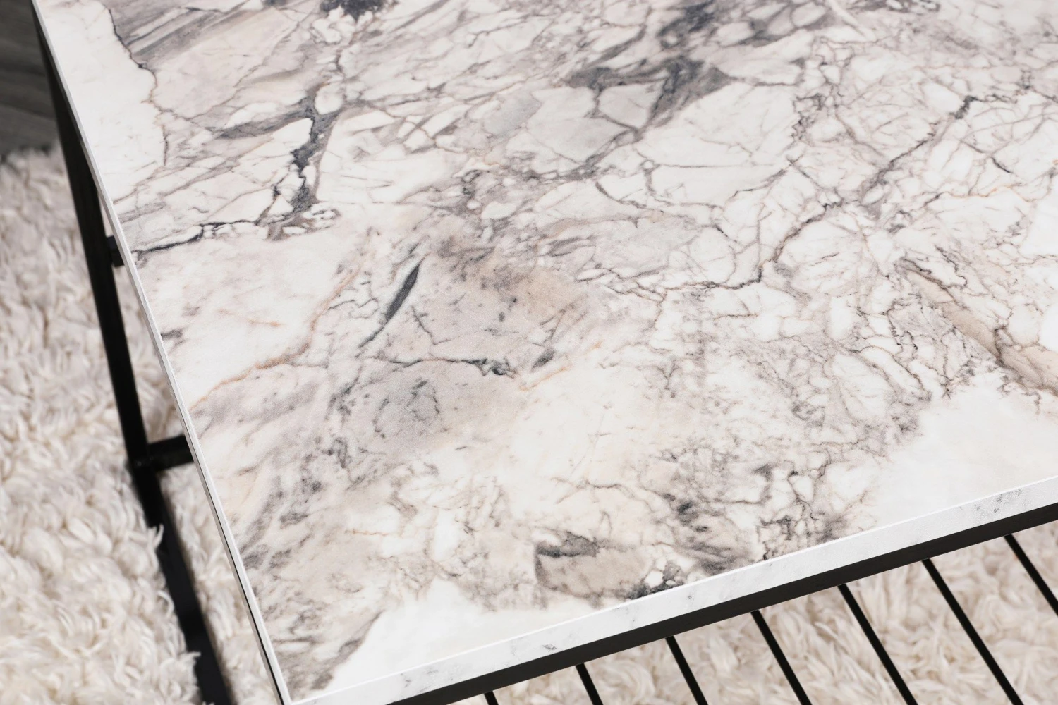 Salontafel heeft een 100% melamine gecoate spaanplaat constructie met een dikte van 18 mm. Hij heeft elektrostatisch gepoedercoate metalen poten en wordt geleverd in een strakke wit-zwarte kleur. Afmetingen: 95 cm breed, 43 cm hoog en 55 cm diep, met een 17 cm plankhoogte