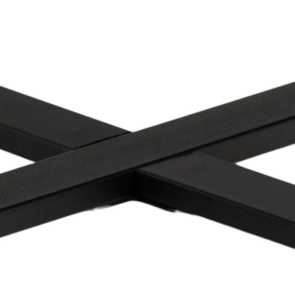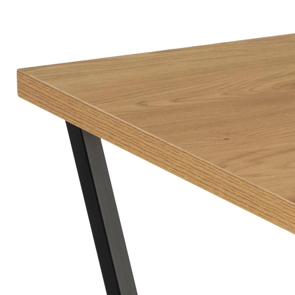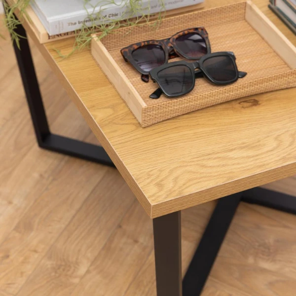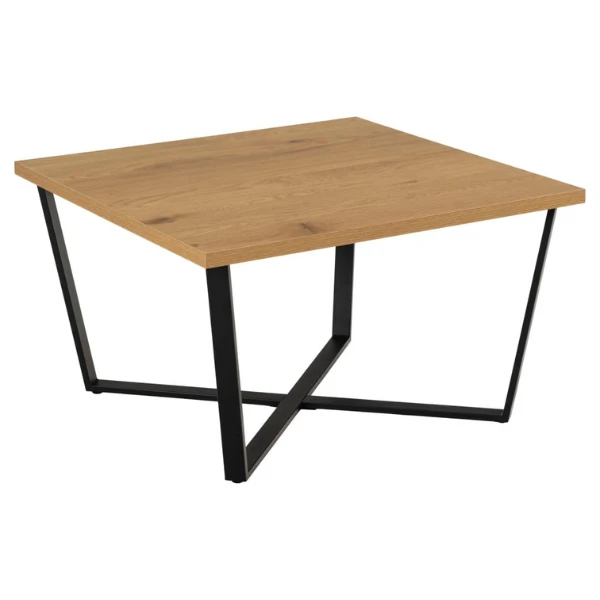 Salontafel Amble past goed in een industrieel ingerichte woonkamer. Enerzijds door haar metalen poten, die zwart gepoedercoat zijn en elkaar kruisen, anderzijds door haar tafelblad in wilde-eikdecor.