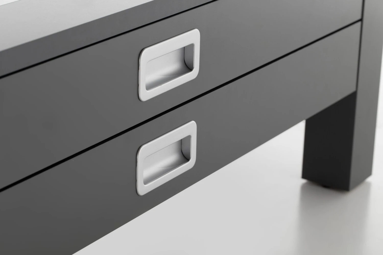 Donkergrijze salontafel Yadran met 2 lades, gemaakt uit MDF en spaanplaat, met 2-ledig tafelblad in glas.