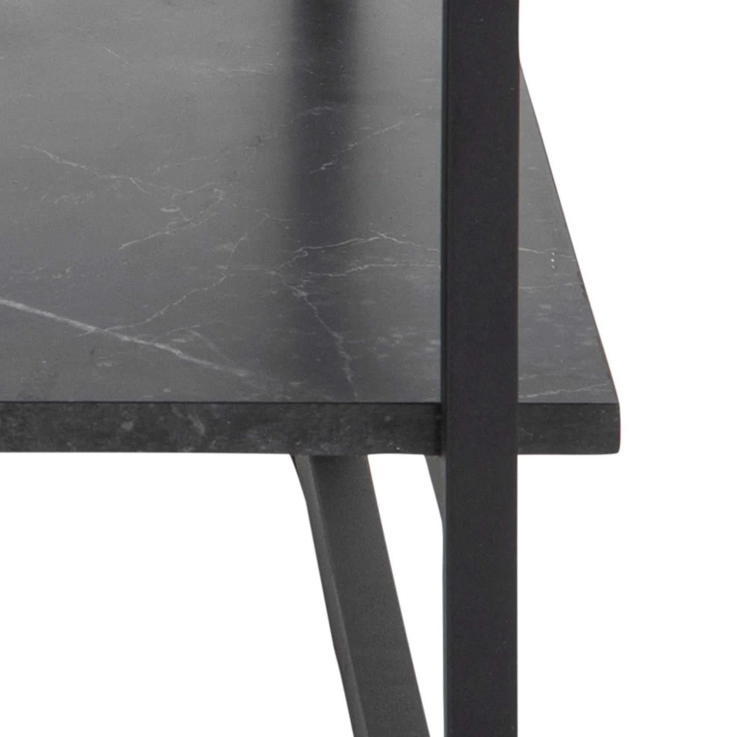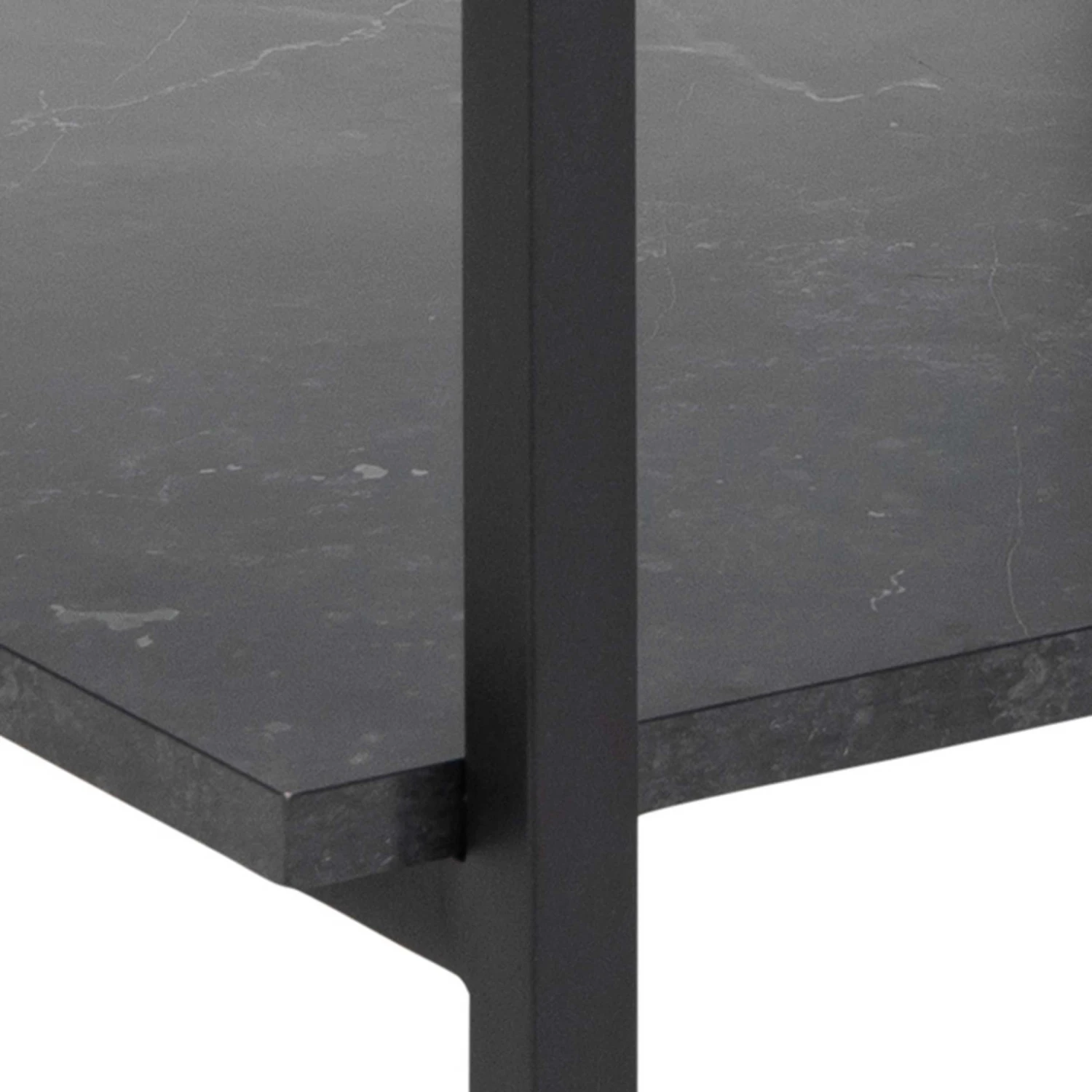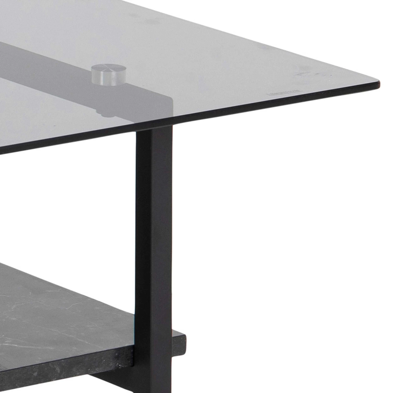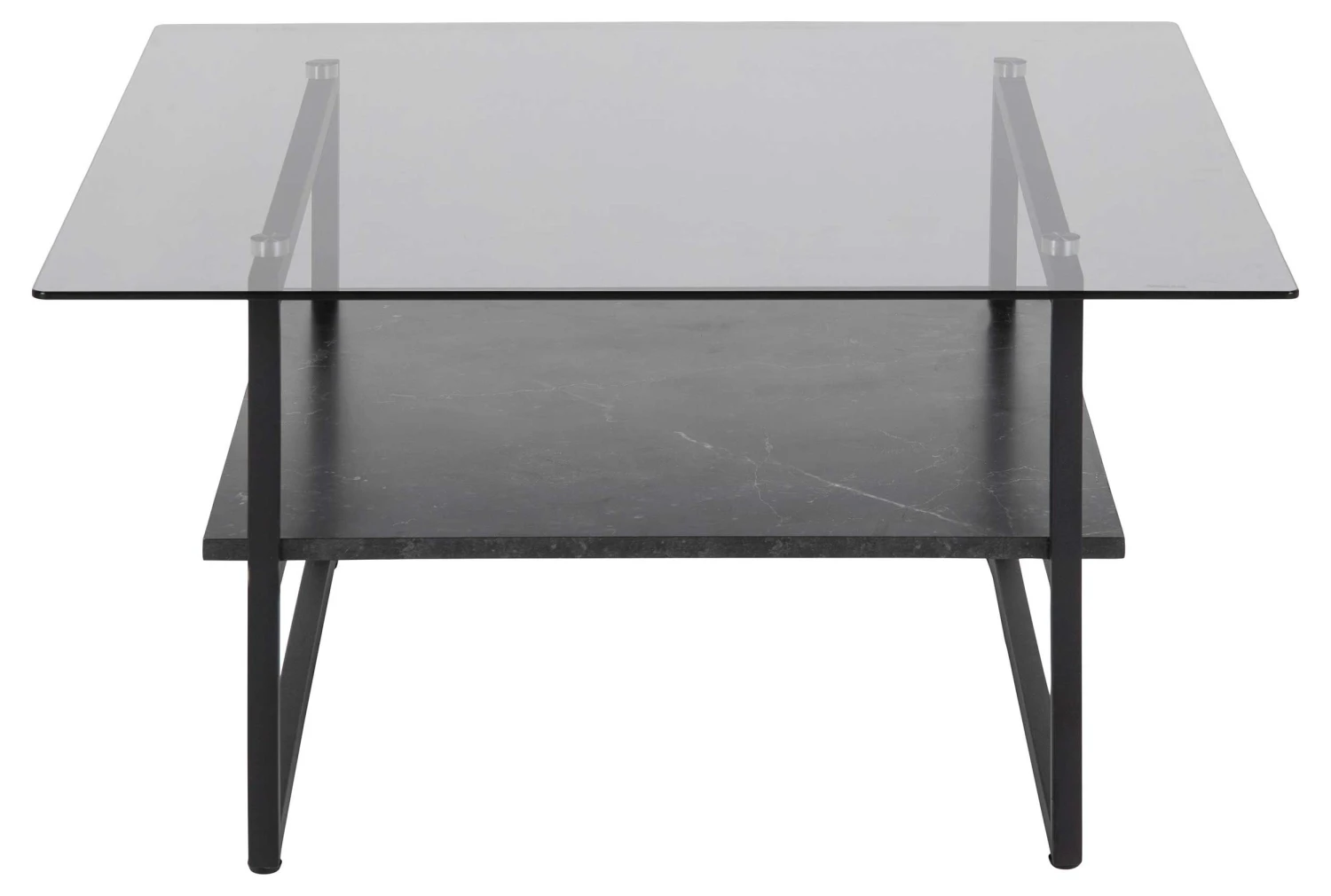 Vierkante salontafel Yanna met glazen blad, legplank in marmerlook en mat zwarte poten.