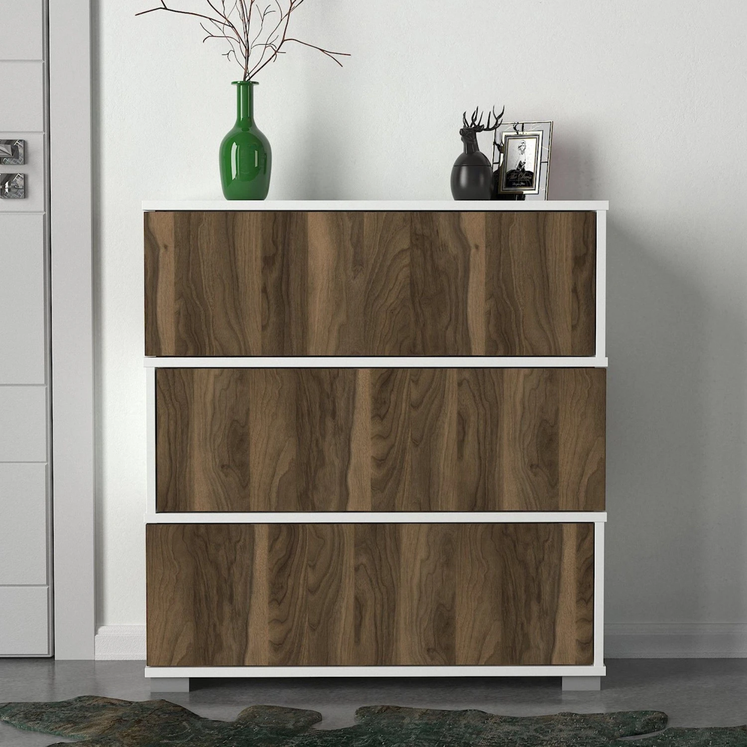 Een schoenenkast is ideaal, wanneer je korte metten wilt maken met rondslingerende schoenen. Schoenenkast Finn is gemaakt uit spaanplaat en is voorzien van een walnootdecor. Het warme, donkere hout contrasteert mooi met het frisse wit. In deze schoenenkast is er plaats voor een twaalftal paar schoenen.