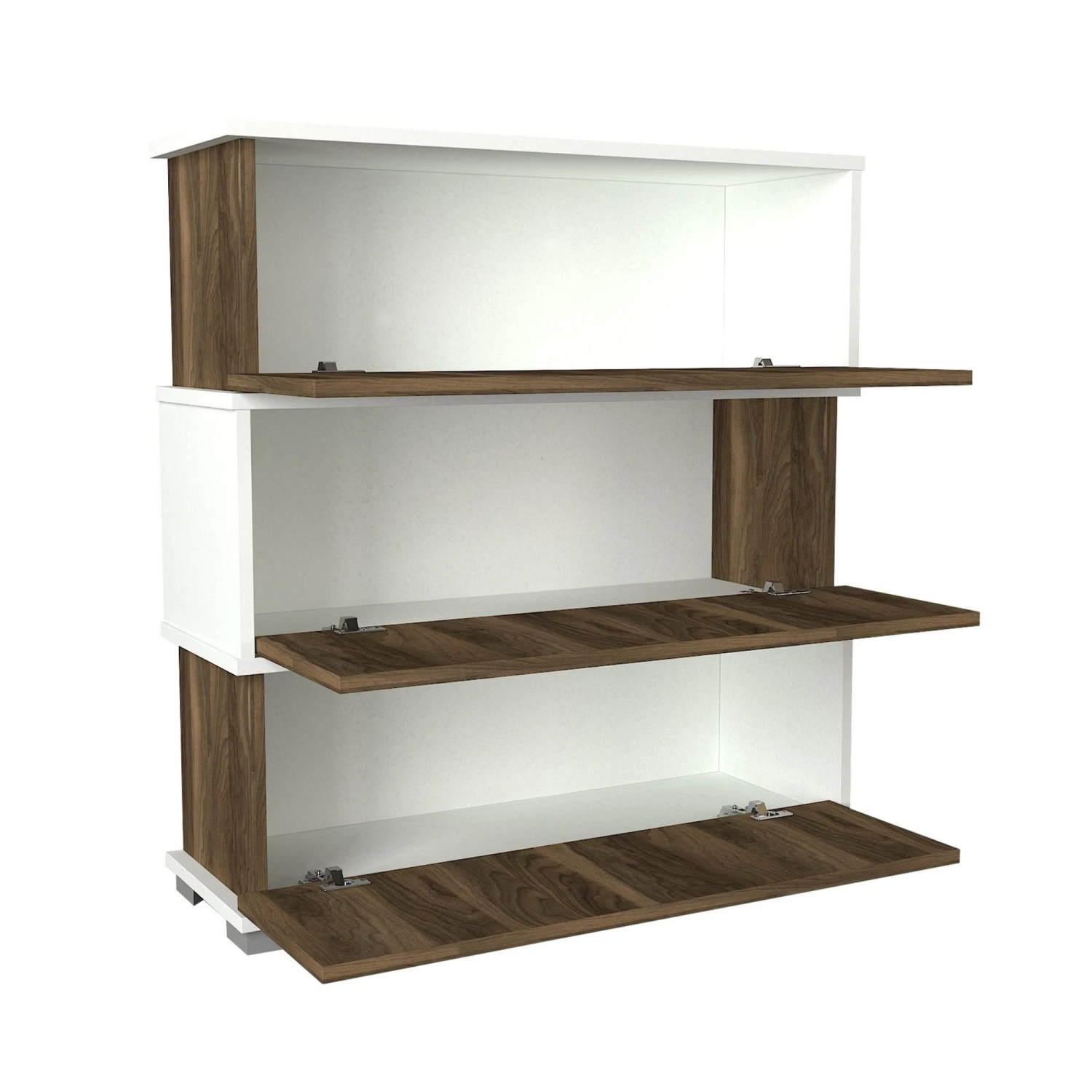 Schoenenkast Finn, gemaakt uit spaanplaat en voorzien van een walnootdecor. Plaats voor ongeveer 12 paar schoenen. 90x30x93 cm.