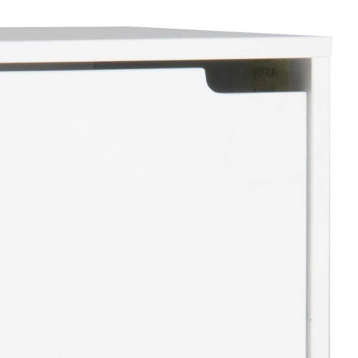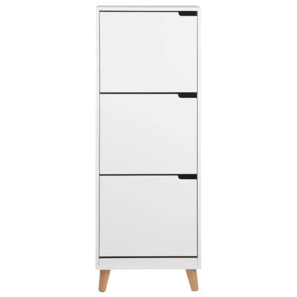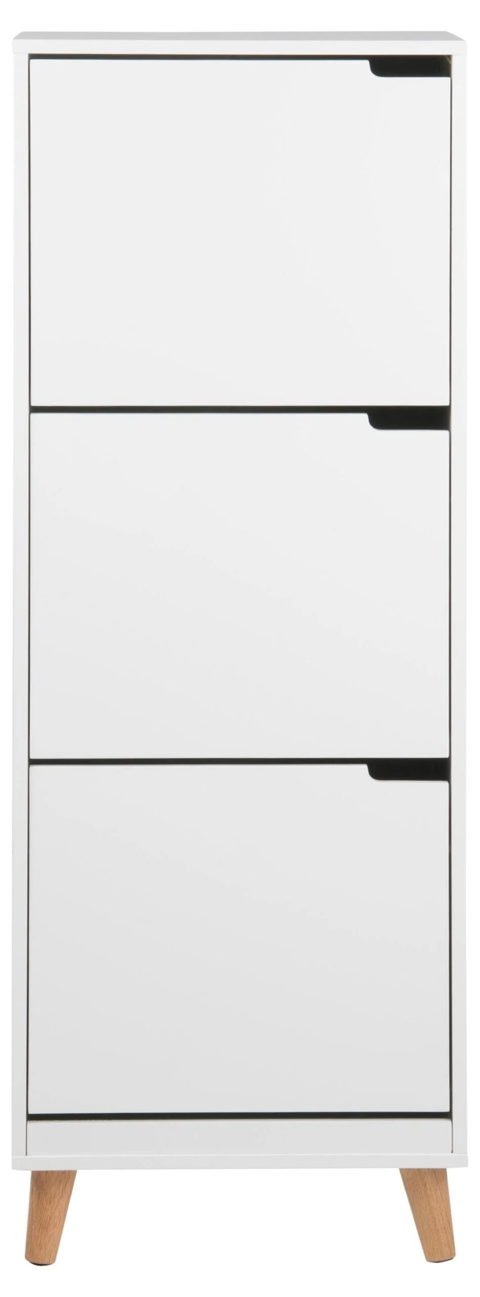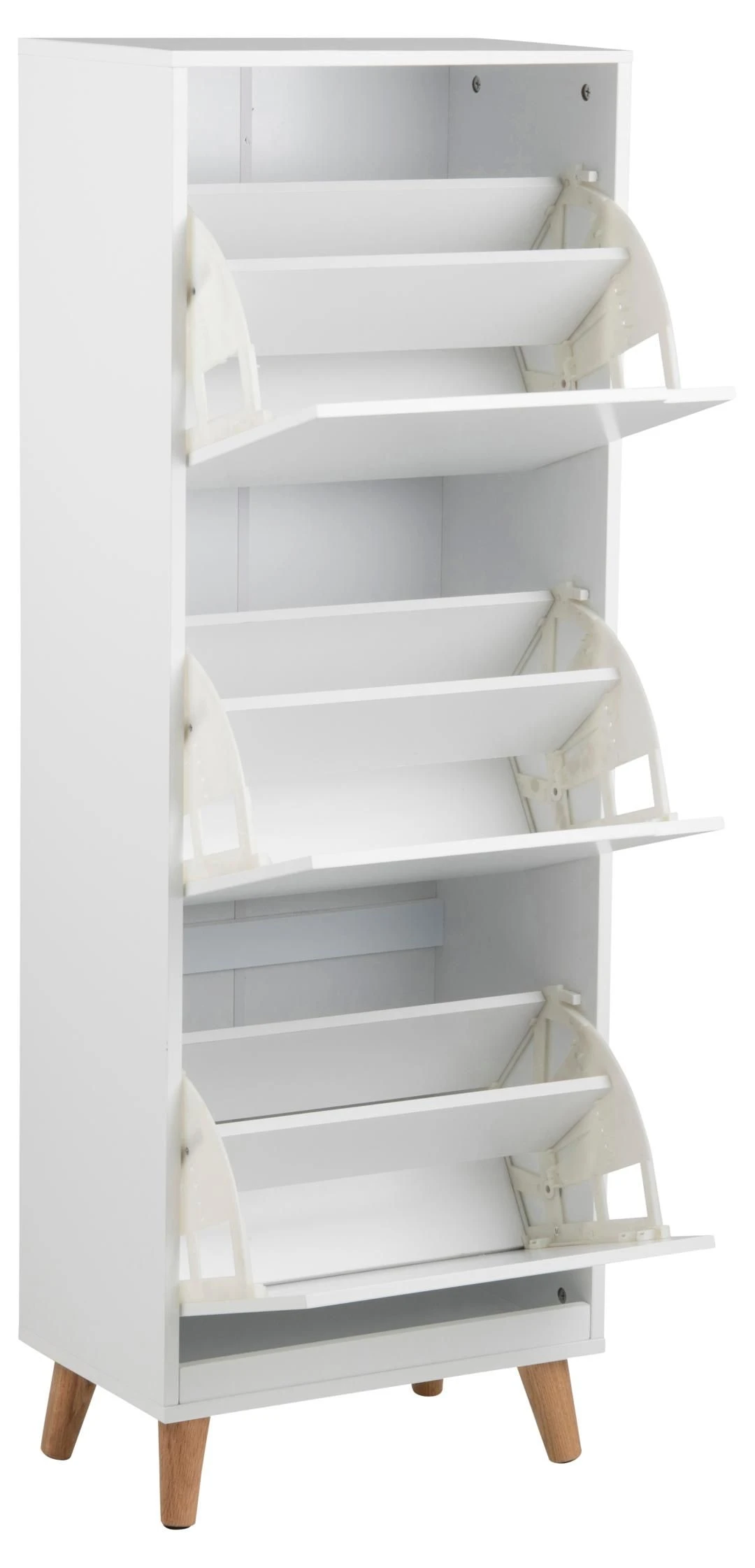 Klassiek Scandinavisch design is een must en deze witte schoenenkast is daar het bewijs van. De schoenenkast, die op schuine houten poten staat, krijgt een licht retrogevoel. De kast biedt veel opbergruimte dankzij de drie opklapdeuren. Deze deuren worden elk verdeeld in twee planken.