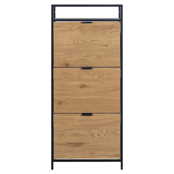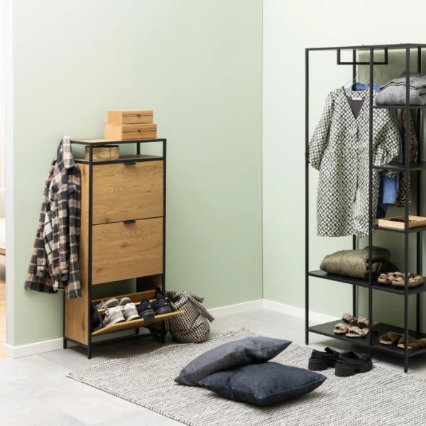 De Seaford schoenenkast is niet alleen praktisch, maar geeft je ruimte ook een esthetisch tintje. Het matzwarte ruw gepoedercoate stalen frame en onderstel creëren een moderne en verfijnde look, terwijl de matwild eiken ruw papier laden en plank een vleugje warmte en natuurlijke schoonheid toevoegen. Door deze combinatie van materialen past de kast naadloos in elke interieurstijl.