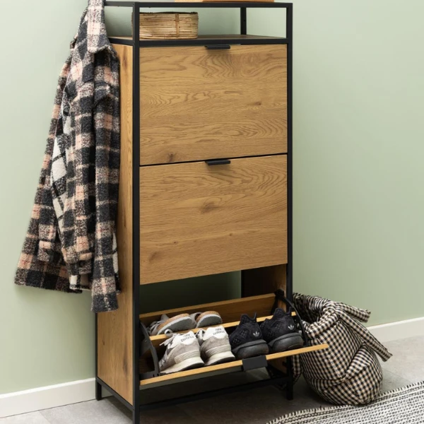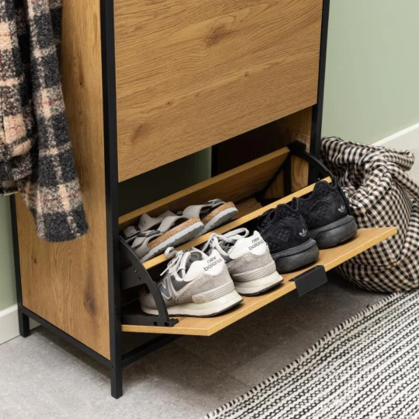 Een van de belangrijkste kenmerken van de Seaford schoenenkast is de mogelijkheid om je schoenen georganiseerd en gemakkelijk toegankelijk te houden. Met drie ruime lades kun je je schoenen netjes opbergen en categoriseren, waardoor rommel wordt voorkomen en je kostbare tijd bespaart als je je klaarmaakt. De toevoeging van een plank zorgt voor extra opbergruimte voor andere spullen zoals tassen of hoeden.