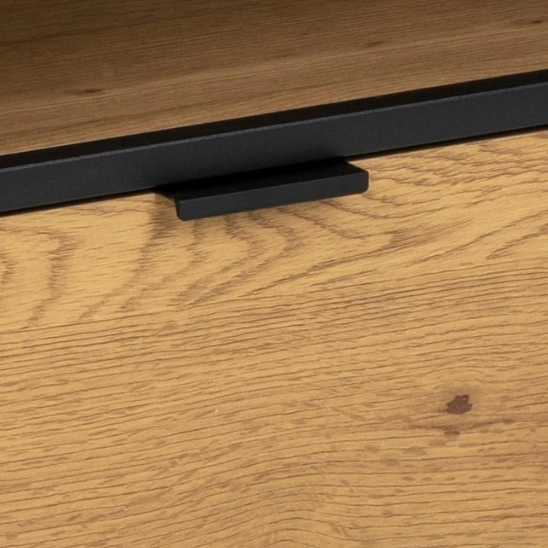 Maak kennis met de Seaford kast: strak, stevig ontwerp gemaakt van zwart gepoedercoat staal met eiken accenten. Inclusief flessenrek en glashouder voor extra gemak. Afmetingen: 77x40x105 cm.
