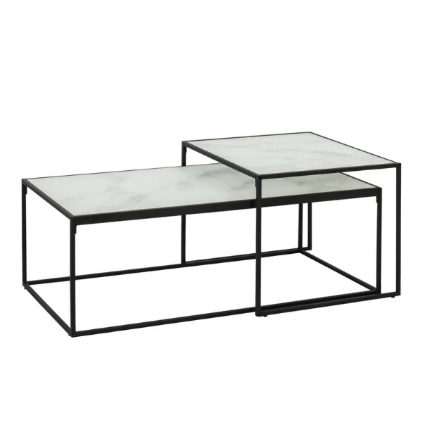 Set van 2 salontafels Dejan, met glazen tafelblad in marmerprint. Onderstel is gemaakt uit zwart gepoedercoat metaal.