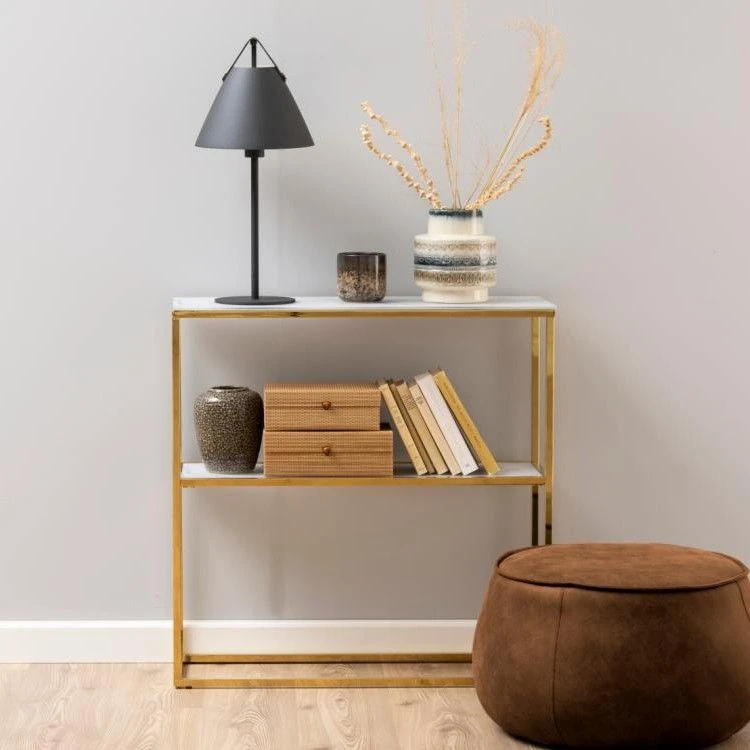 De Anika sidetable is ideaal om in de hal of de woonkamer te plaatsen. Deze sidetable is zeer praktisch dankzij haar extra legplankje. Je kan gemakkelijk een lampje, kaars of plant op het tafelblad plaatsen en boeken of magazines op het legplankje leggen. Deze sidetable is gemaakt uit kunstmarmer in het wit met gouden poten.